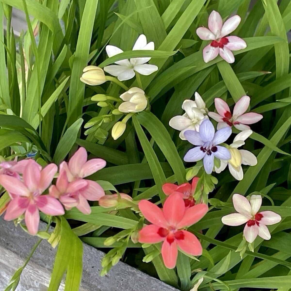 お届けするのはヒメヒオウギの種、5種類のミックスカラー50粒です(+α 少し余分にお入れいたします)。種のサイズは大小様々、5種類混合で一袋に入っています。何色が幾つ入っているかの割合につきましては正確には申し上げられませんが、それぞれの色が7粒以上バランス良く入っているかと思います。どうぞ咲いてからのお楽しみになさって下さい。