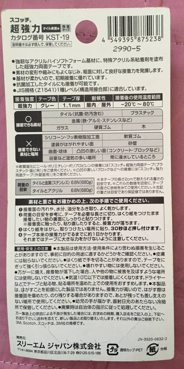 ■画像通りの、住友3M  スコッチ超強力両面テープ タイル表面用19mm×1.5m グレー KST-19です。
