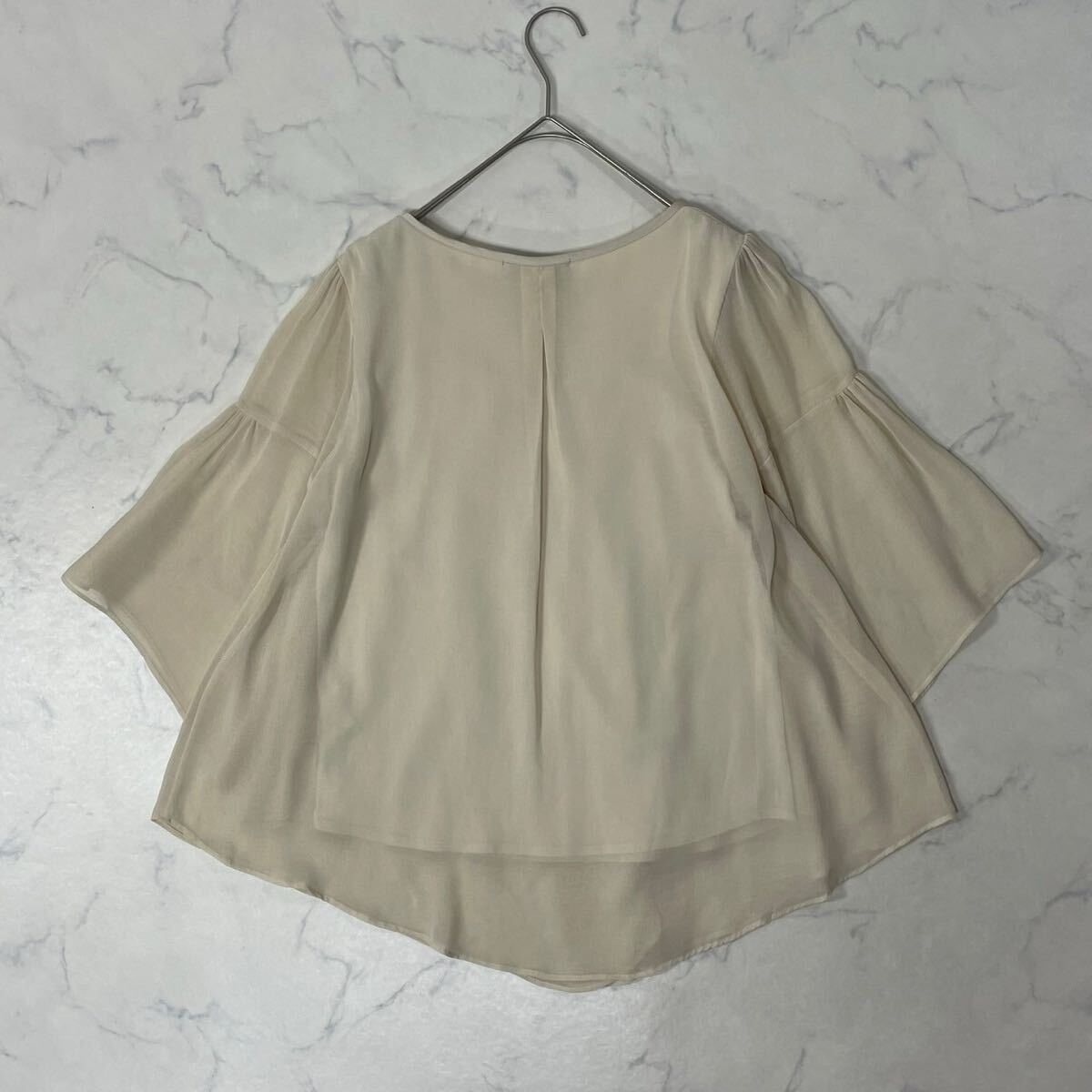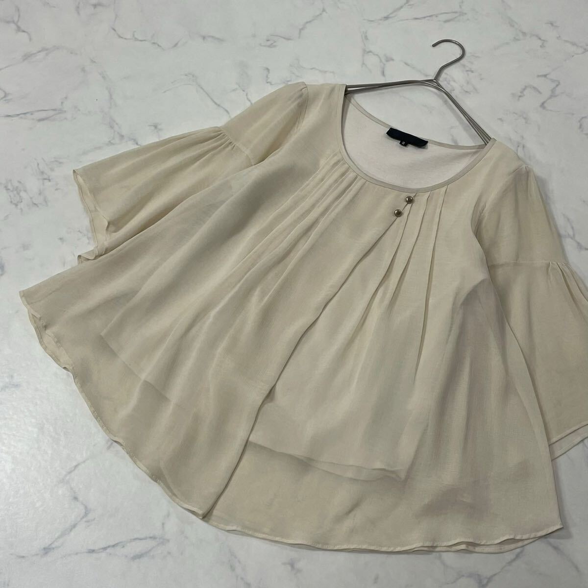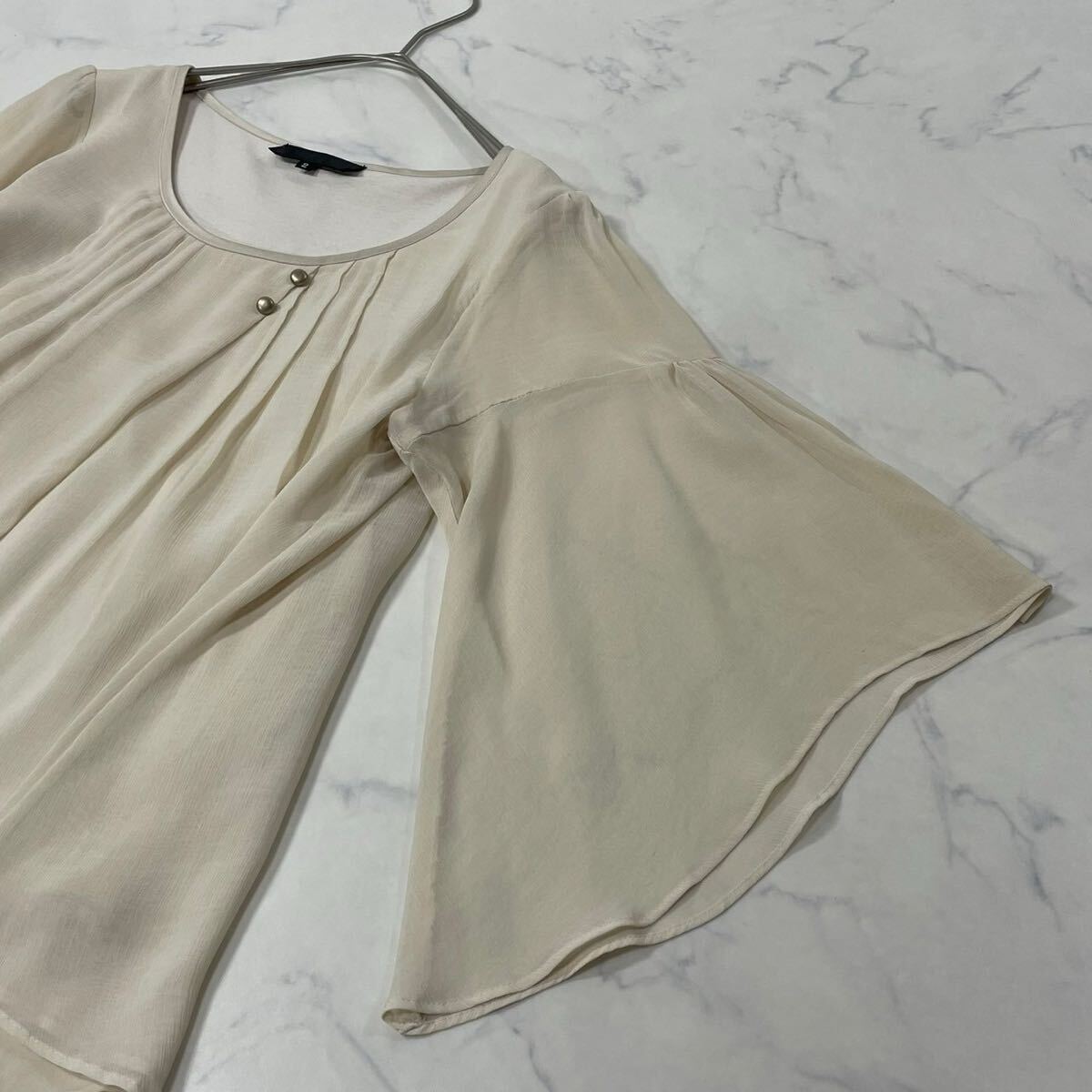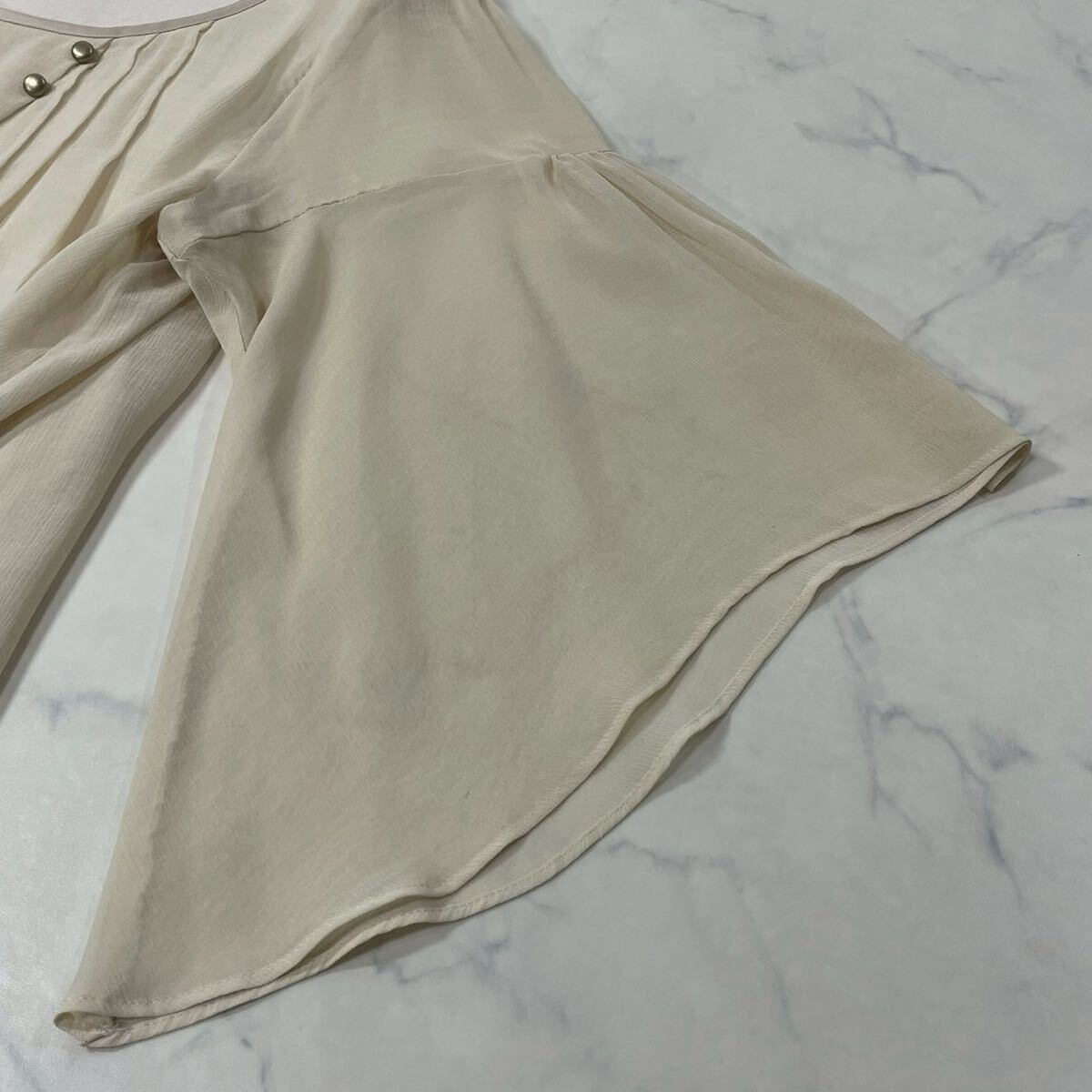 日本製 ワントーン ギャザー タック 飾りリボン クルーネック フレアスリーブ 透け感 七分袖 ブラウス