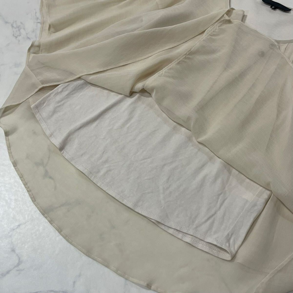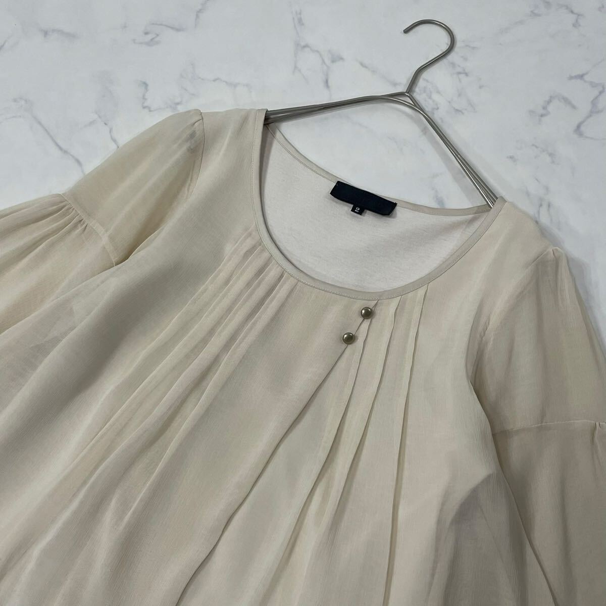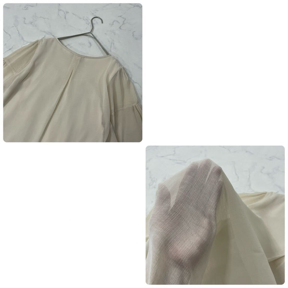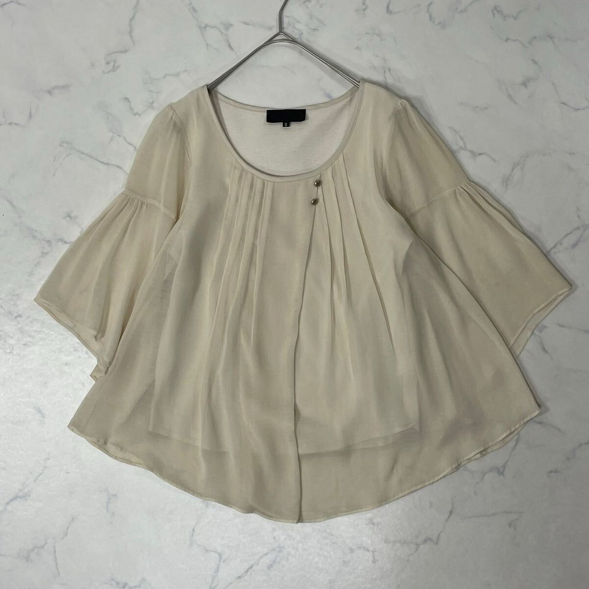 日本製 ワントーン ギャザー タック 飾りリボン クルーネック フレアスリーブ 透け感 七分袖 ブラウス