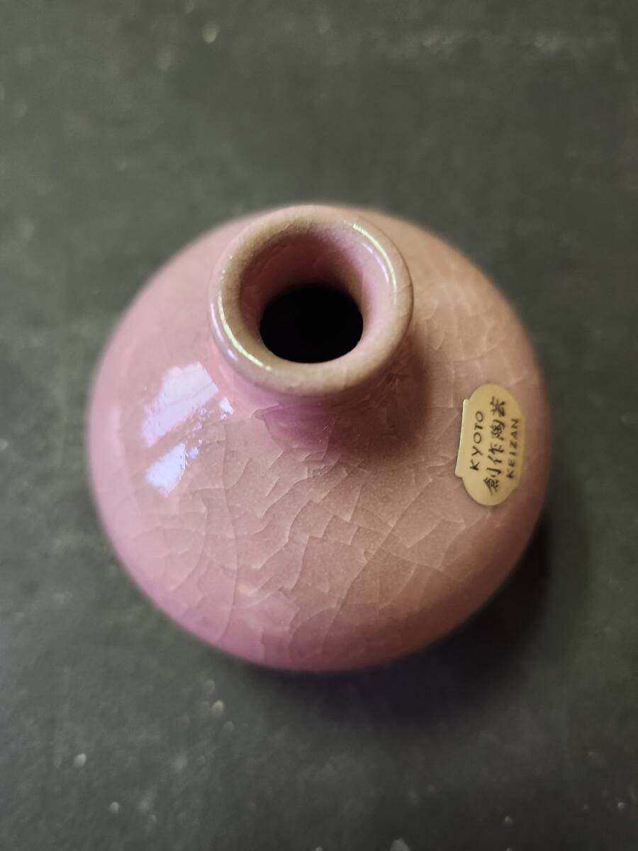 小花や野草を生けるのに可愛らしい落ち着いた桃色の可愛らしい色と形状を兼ね備えたミニ花瓶です。 京都・創作陶芸・渓山窯の作品。 桃色と云っても少し紫や灰色も感じる不思議な風合いです。 適度に入った貫入もデザインとして美しく参加しています。 口径約2.2㎝×最大直径約8㎝×高さ約9㎝。