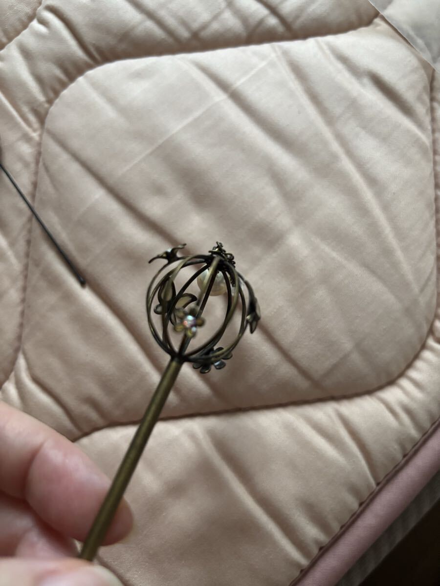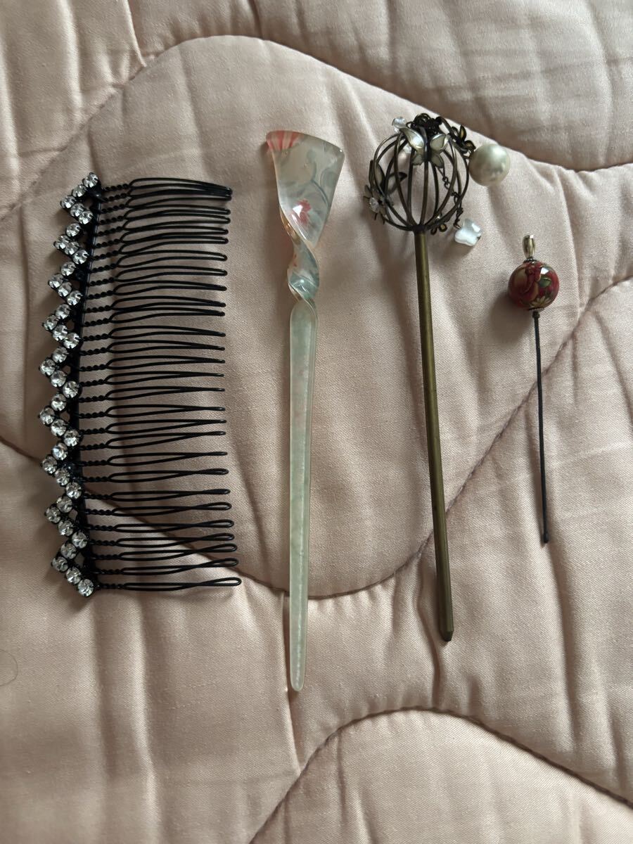 その他、コームは1500円ほど、飾り玉がついたものは1200円ほど、捻りになったカンザシは確か100均で購入しました。