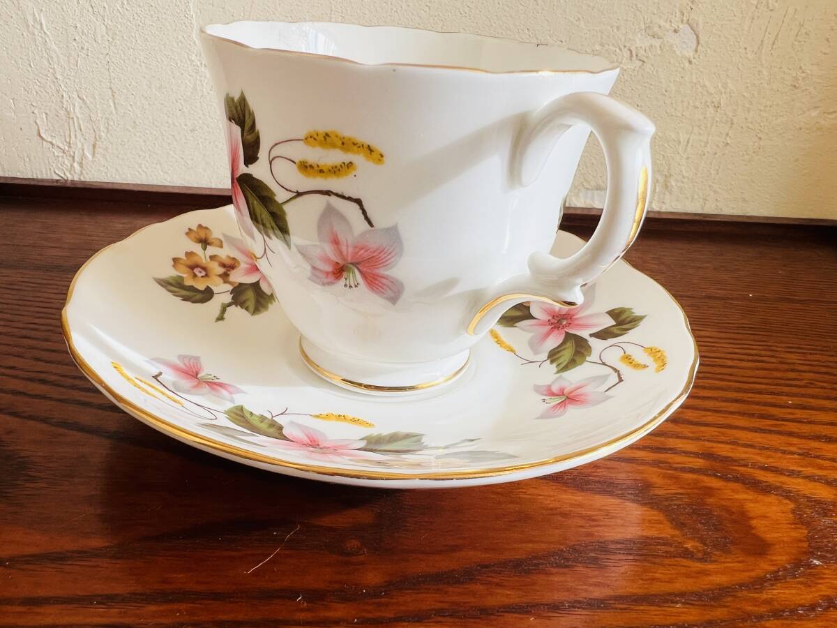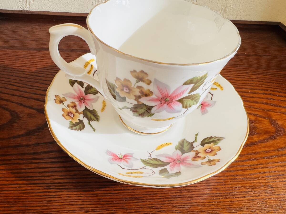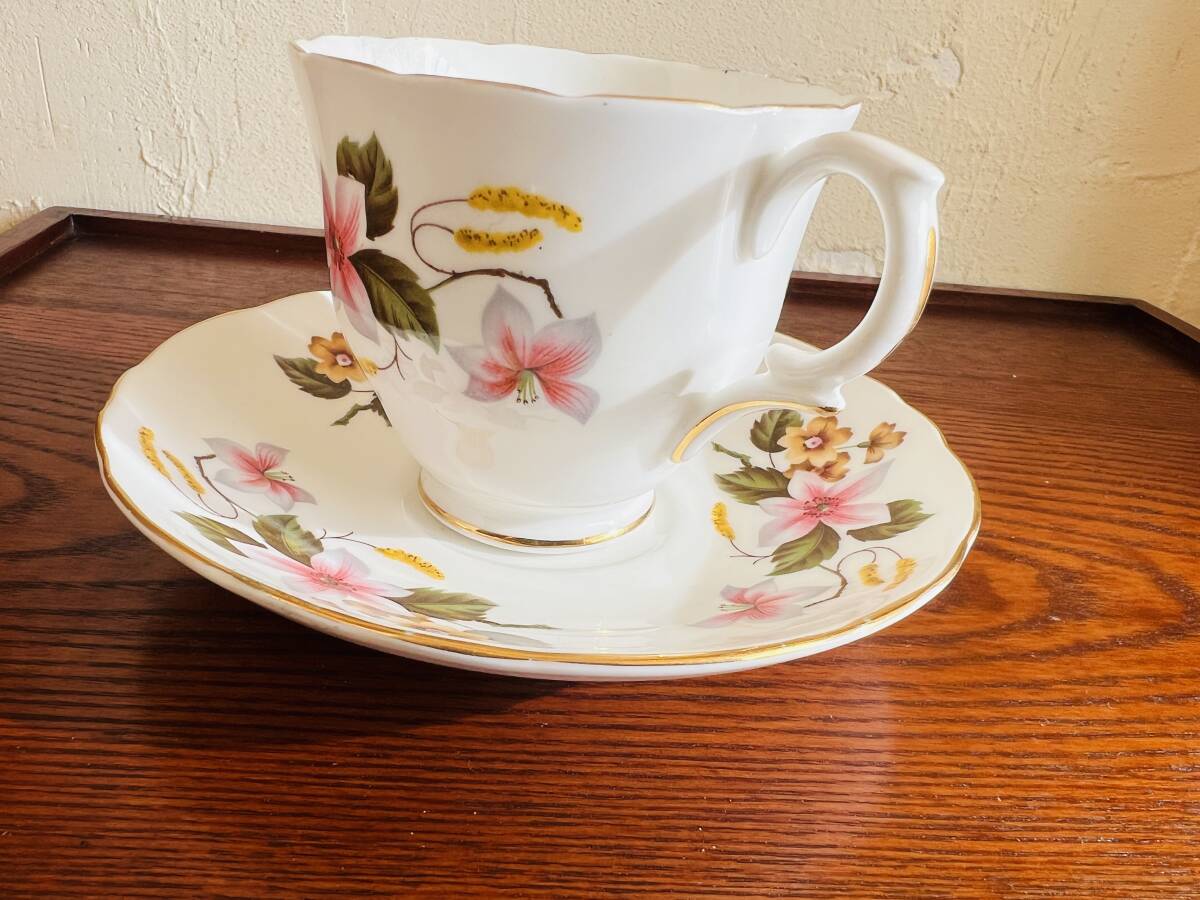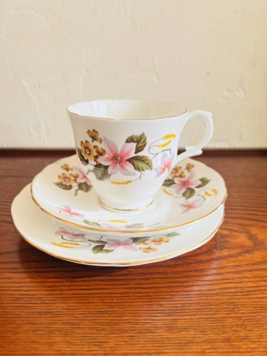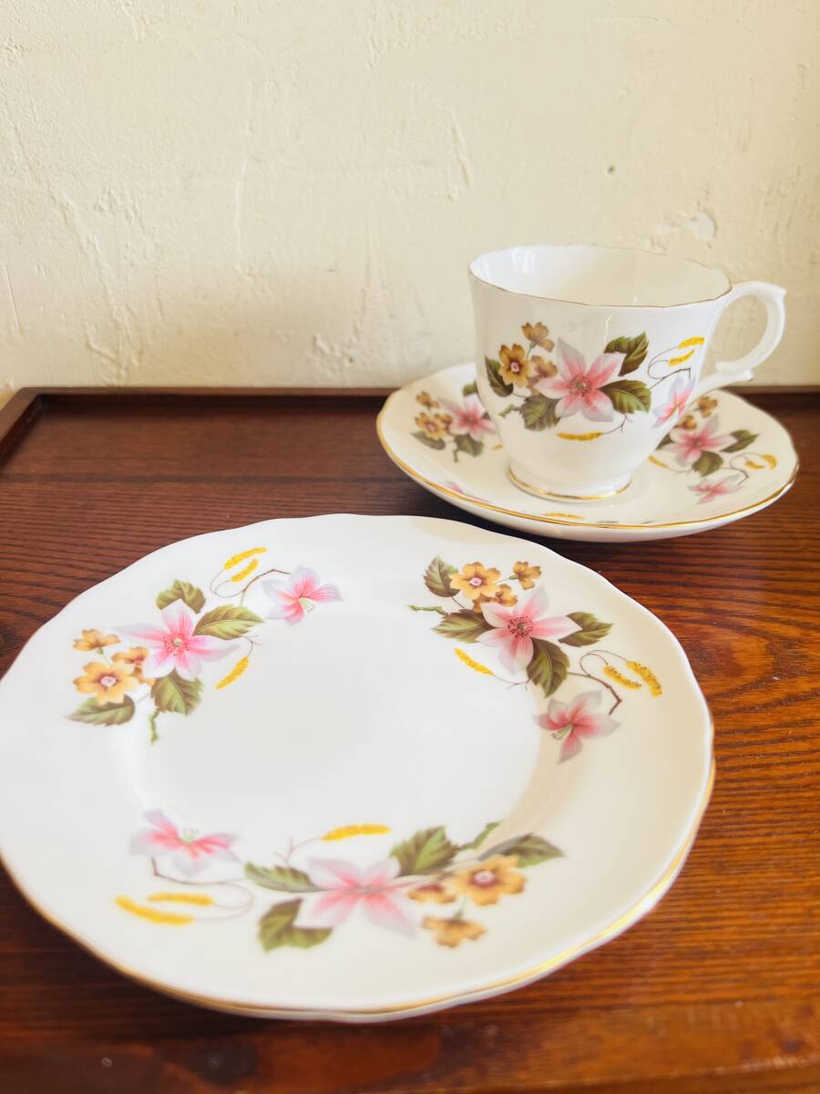 鮮やかな花柄で彩られた、美しいティーセットです。