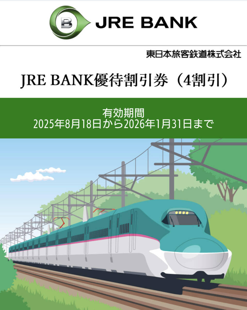 ★★★ JRE BANK優待割引券(JR東日本 優待割引券)=4割引/1枚  取引ナビで通知  2026年1月31日まで ★★★