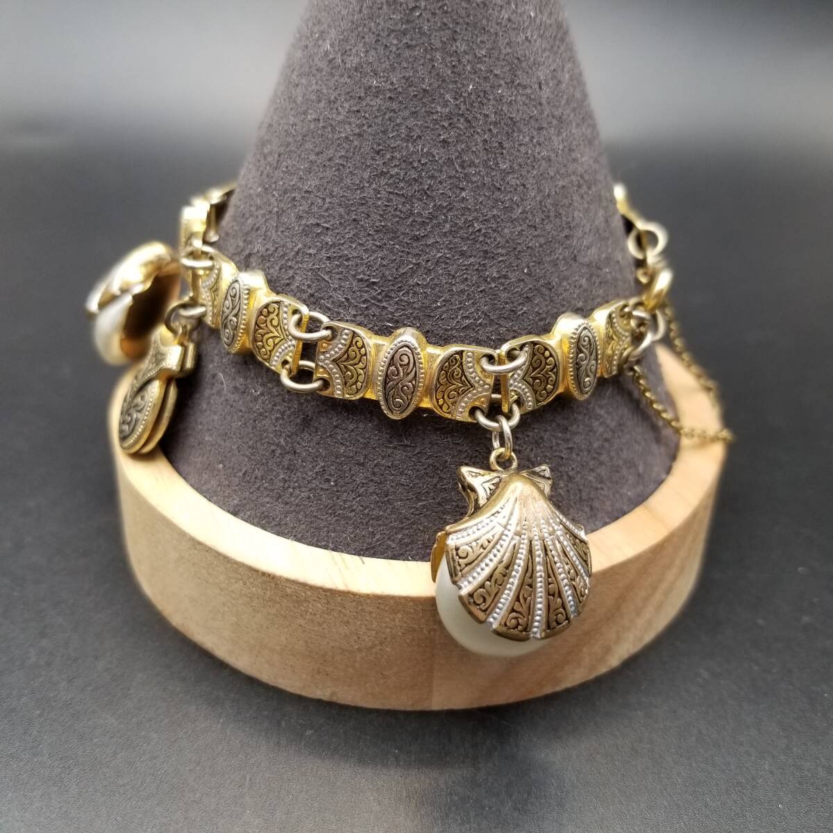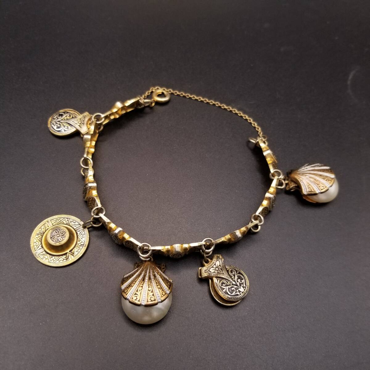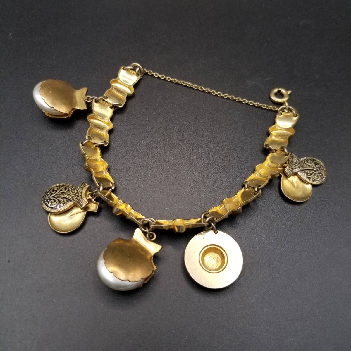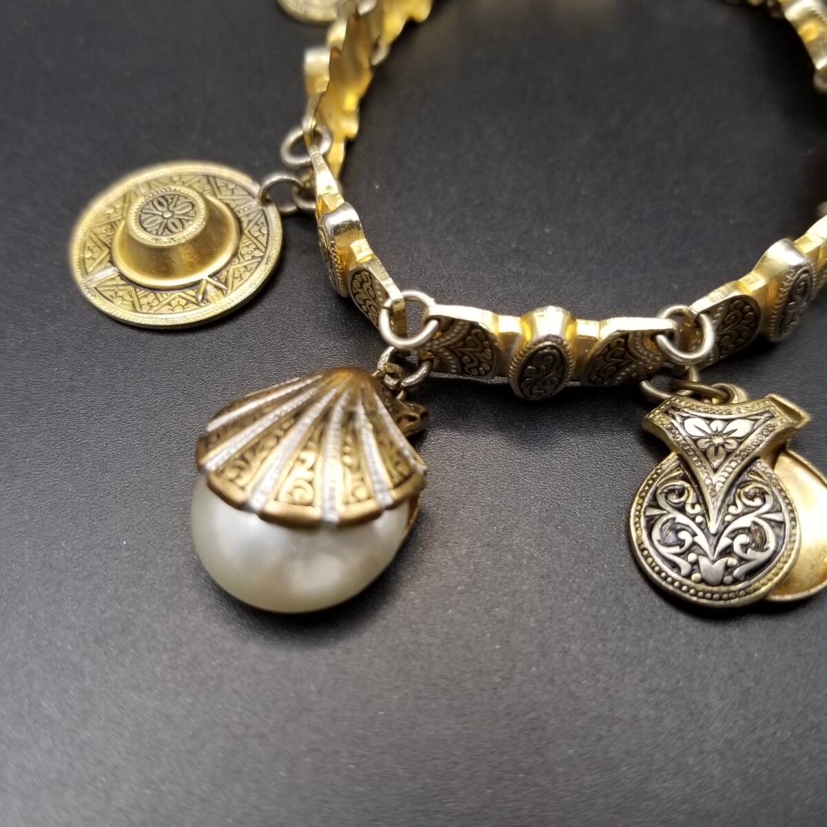 ダマシン スパニッシュチャーム ヴィンテージ ブレスレット ゴールドトーン 象嵌 貝 カスタネット ゴージャスコスチュームジュエリー Y24-B