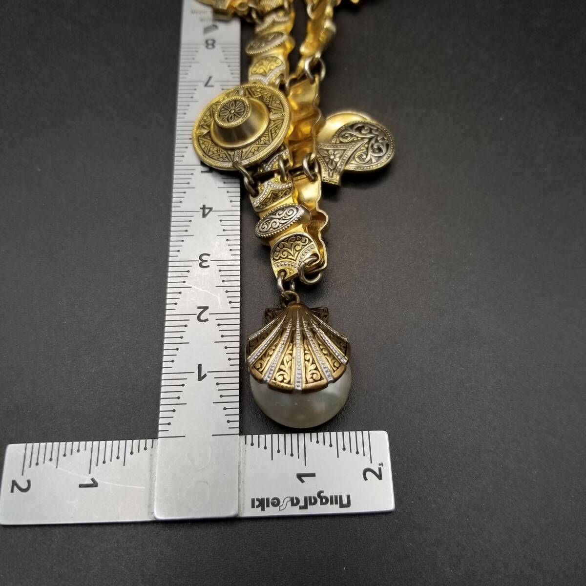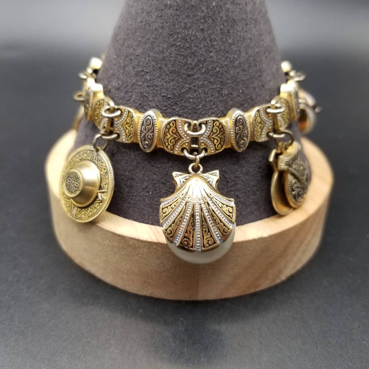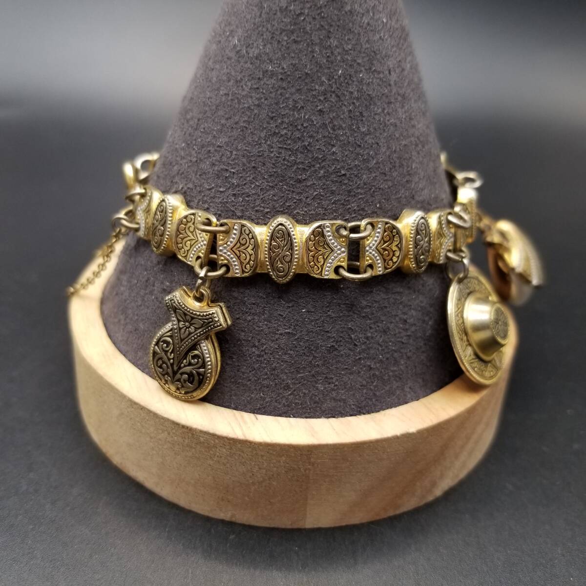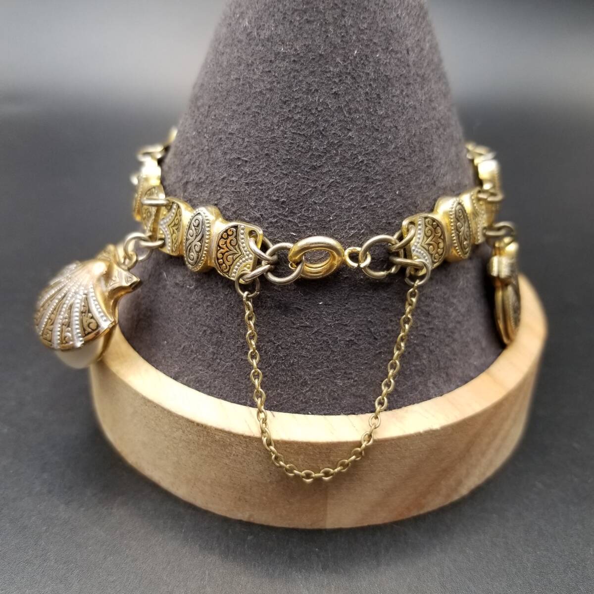 ダマシン スパニッシュチャーム ヴィンテージ ブレスレット ゴールドトーン 象嵌 貝 カスタネット ゴージャスコスチュームジュエリー Y24-B