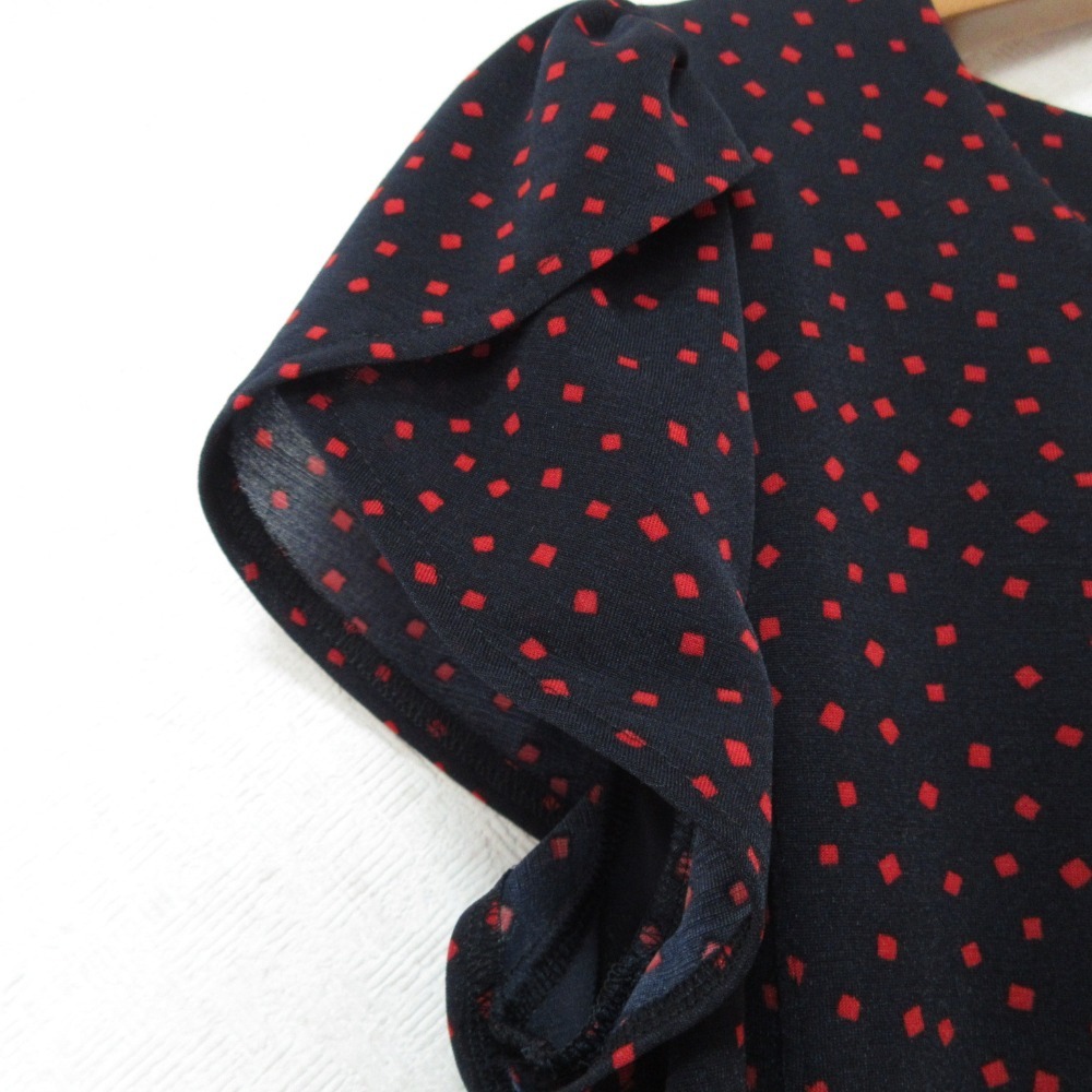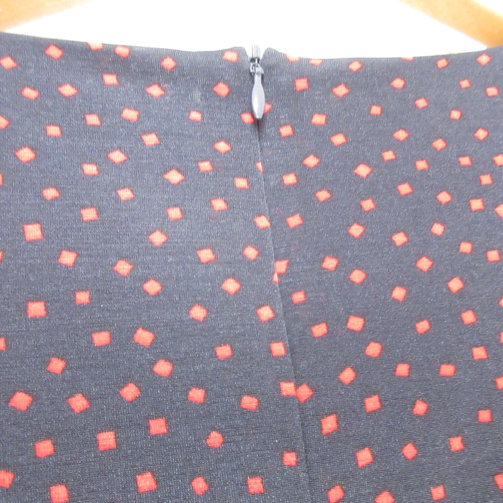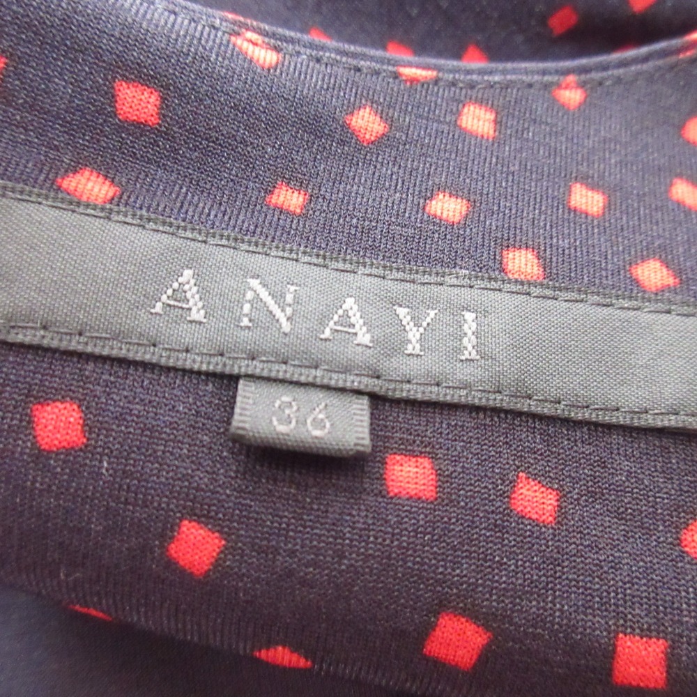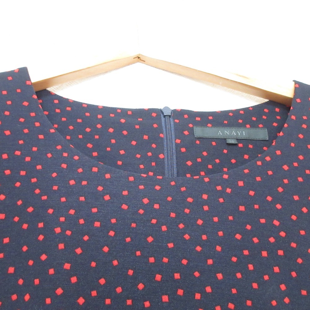 商品名:ANAYI アナイ スクエアドット柄 フレンチスリーブ ひざ丈 ベルテッド ワンピース 36 ネイビー