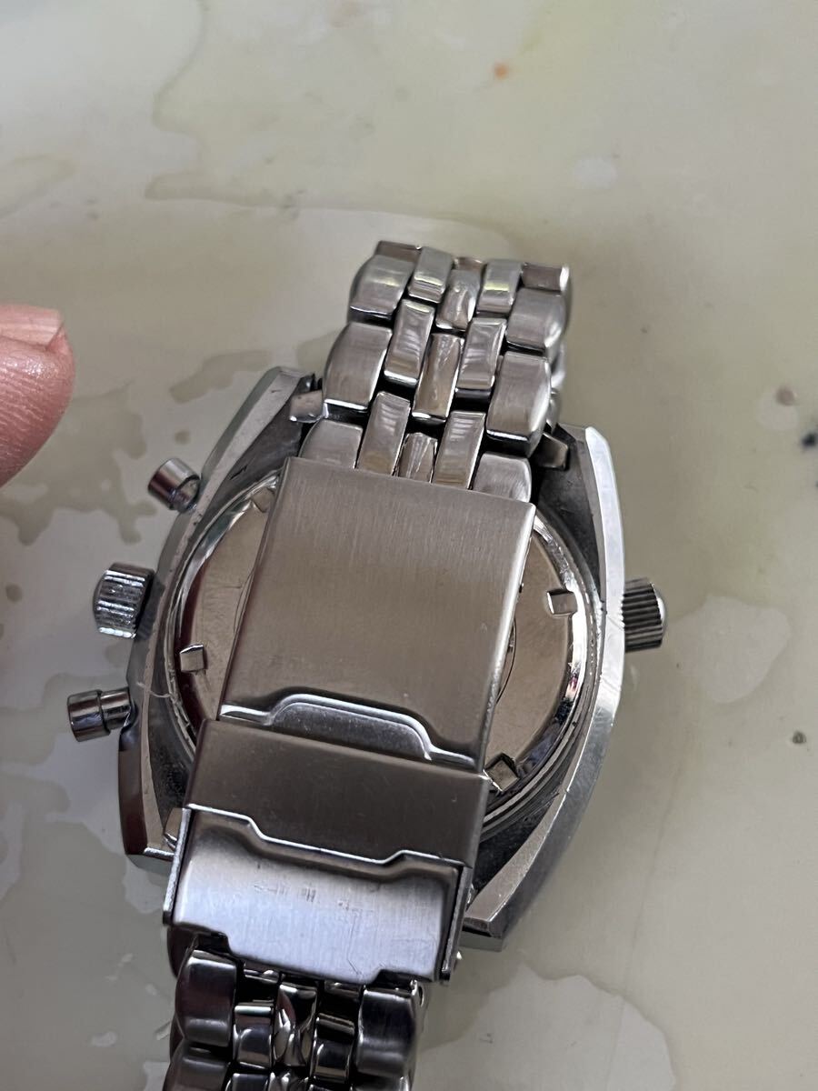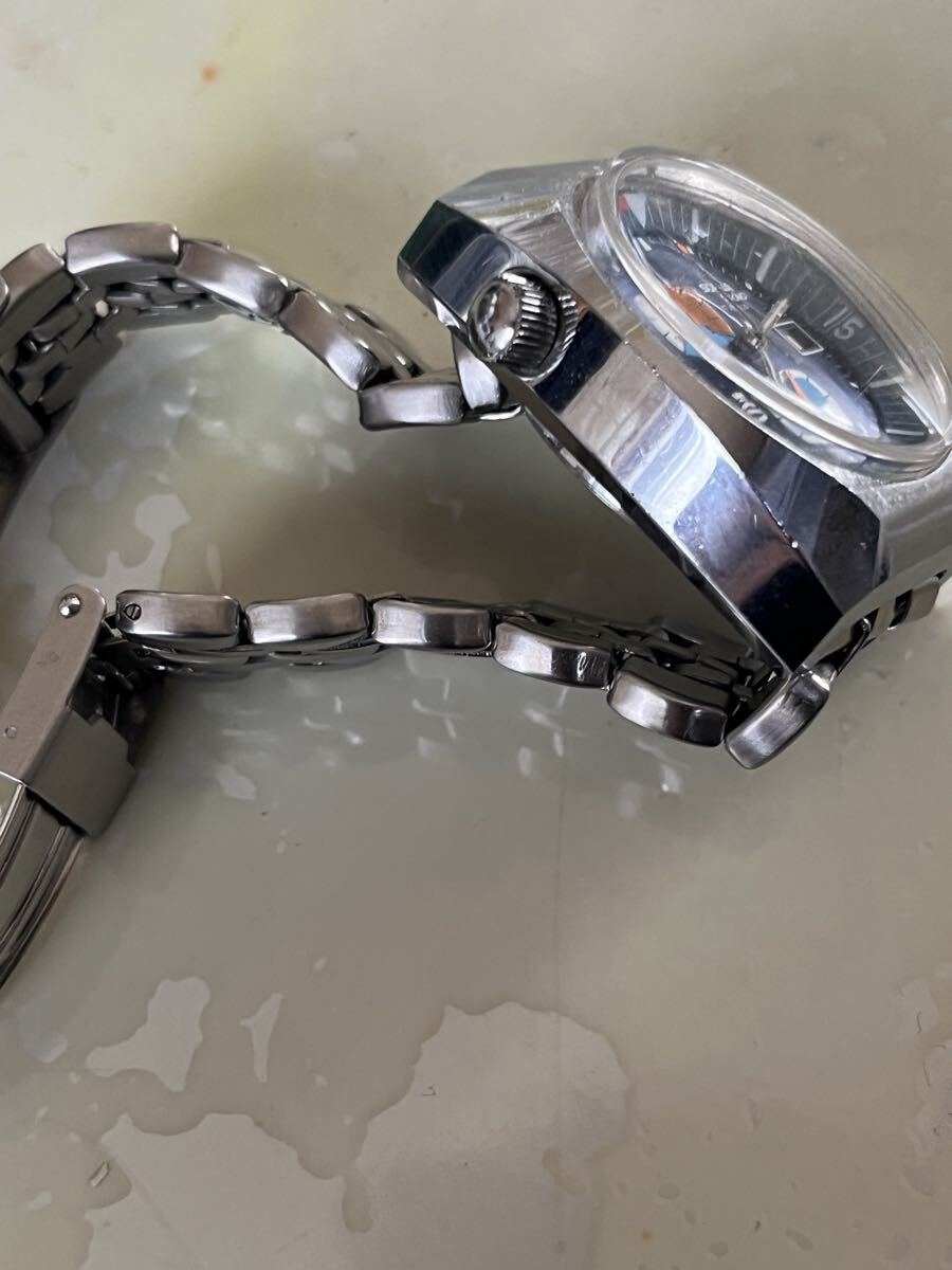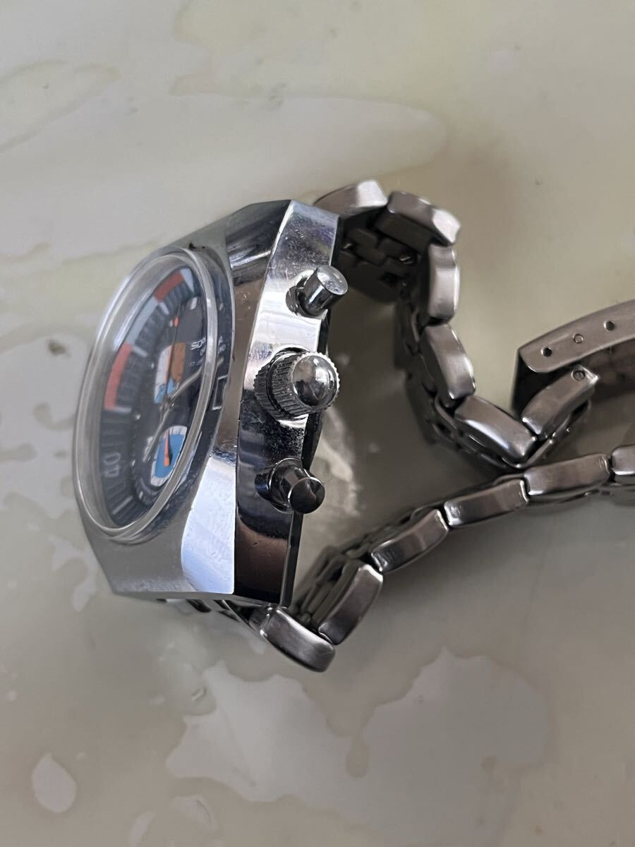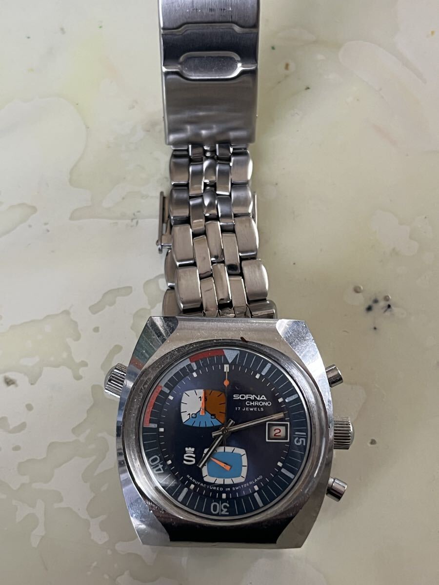 SORNAのCHRONOです。SORNAはクォーツショック後まで頑張ってスイスで経営されていましたが、現在では存在しない時計会社となります。デザインが斬新的で現在でも個性的な物となります。中華オマージュ品が時折出品されますが、こちらはSORNAのオリジナル品で貴重です。レガッタ競技用の物で15分のストップウォッチ機能です。操作は普通のクロノと異なり下のボタンを押してスタート、もう一度押すとストップ、上のボタンを押して0帰針となります。左のリューズはベゼル回転用です。