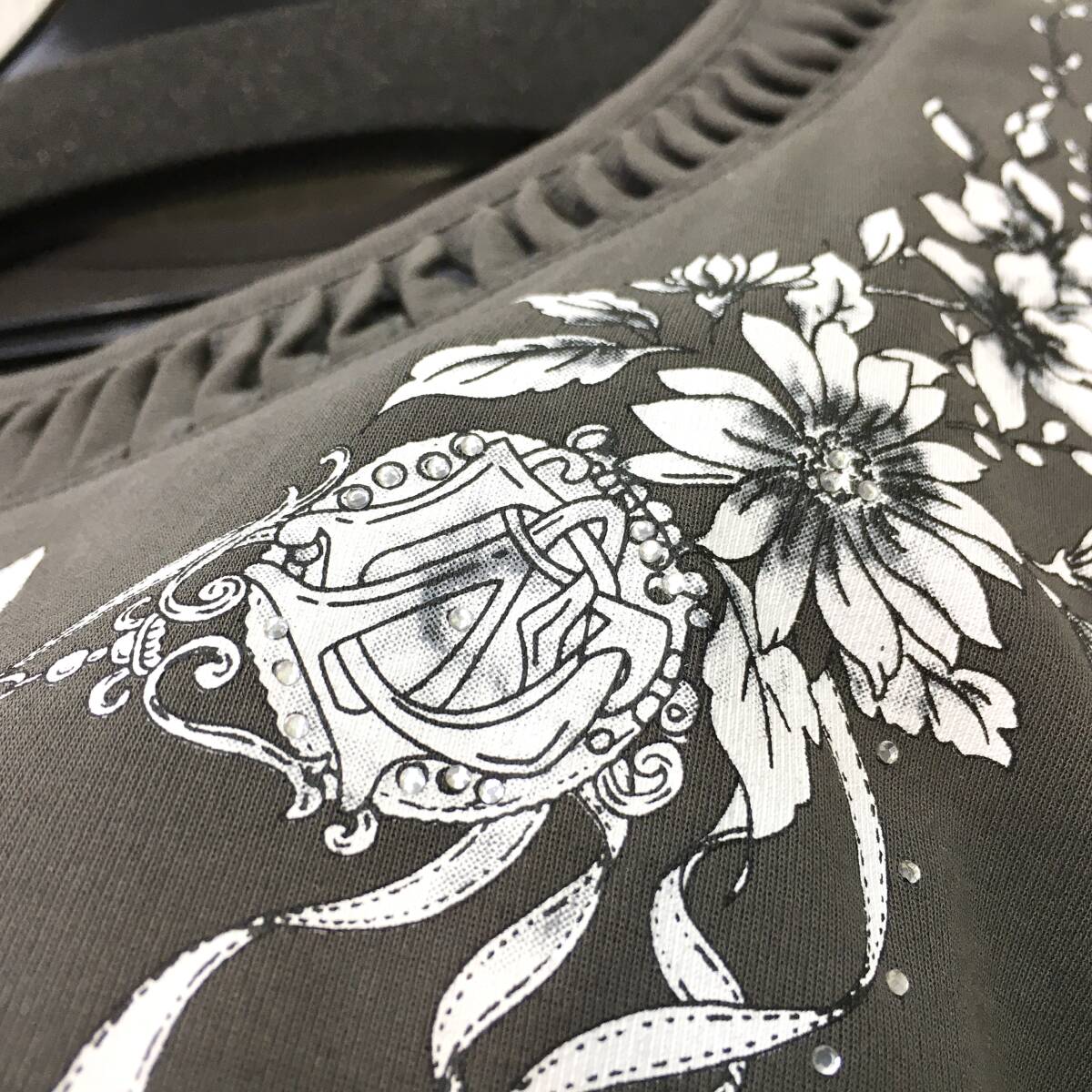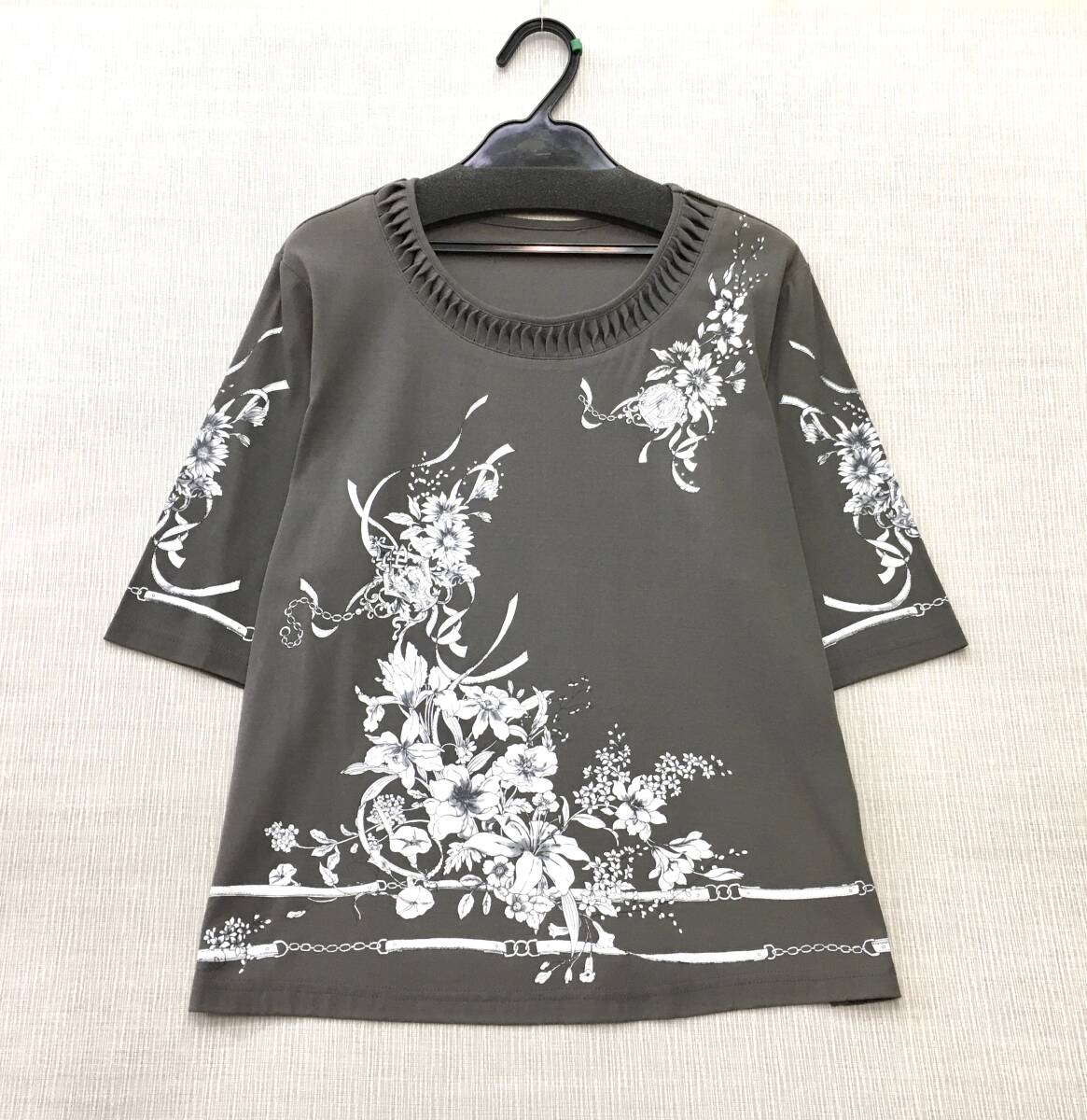 【新品】L 晩夏色 高級綿100% 婦人 5分袖 パネルプリント カットソー Lサイズ 送料無料 手洗いOK 高級Tシャツ クリスタルダイヤ