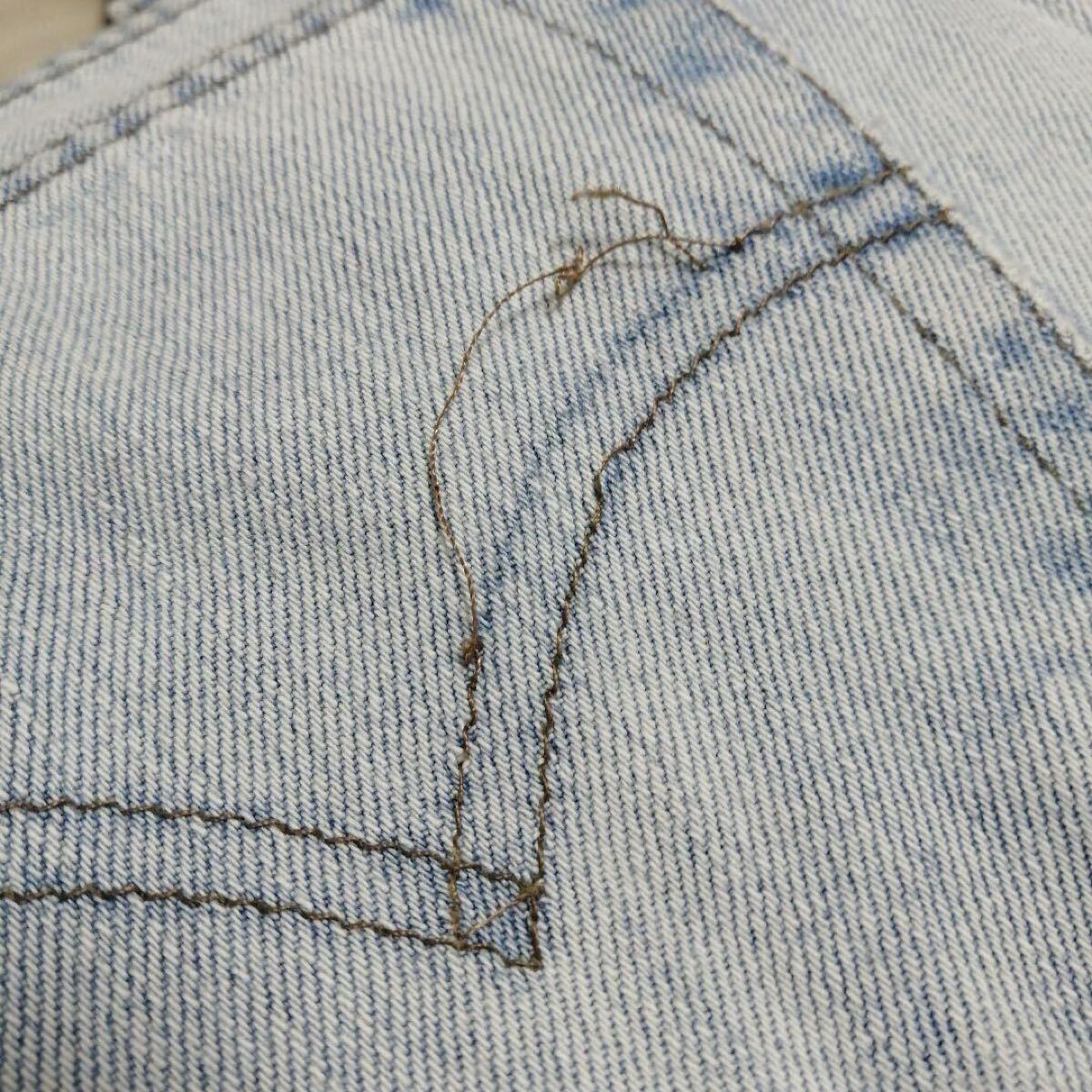 膝から裾に薄汚れ、バックポケットにリペアとステッチ解れ、腰と裾周りに擦れがみられます。