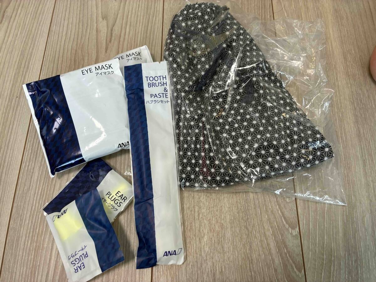 全日空/ANAのアジア路線、ビジネスクラスにて配布された巾着ポーチと小物5点です。