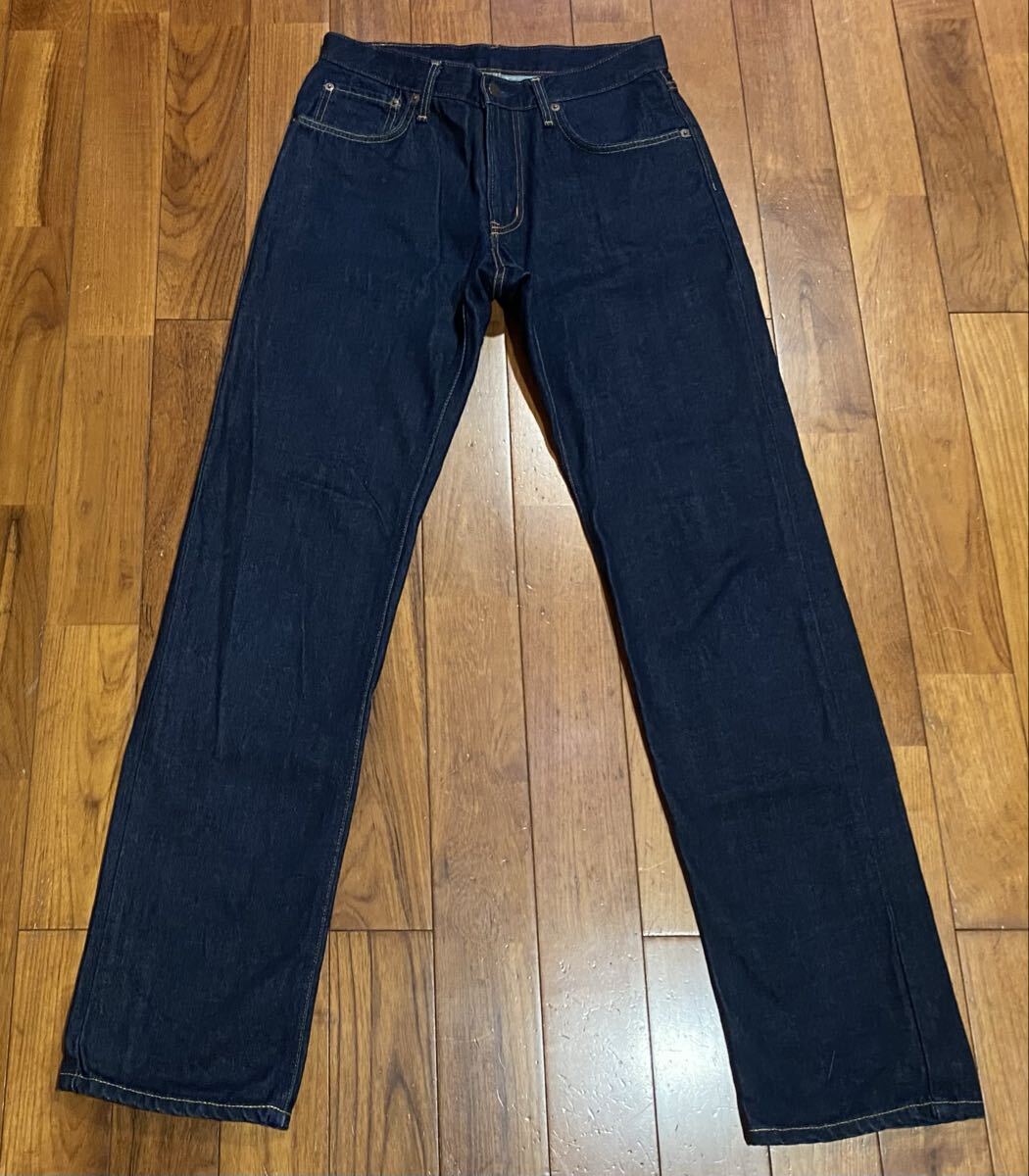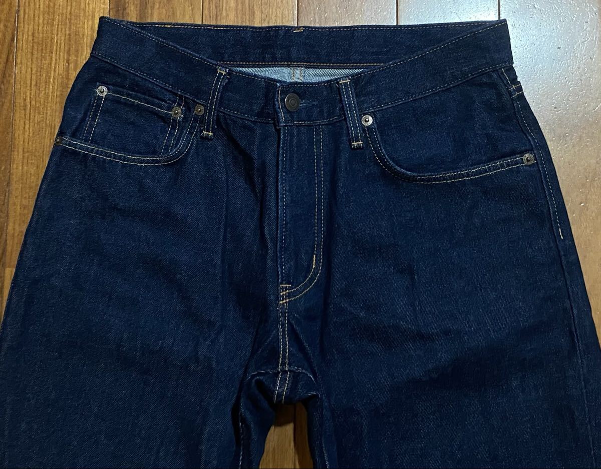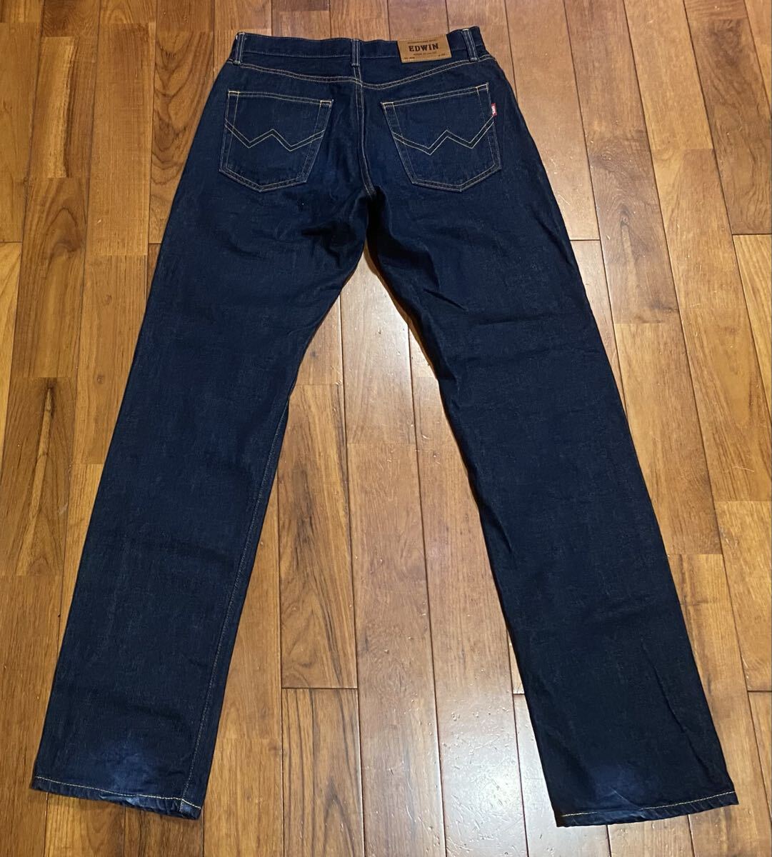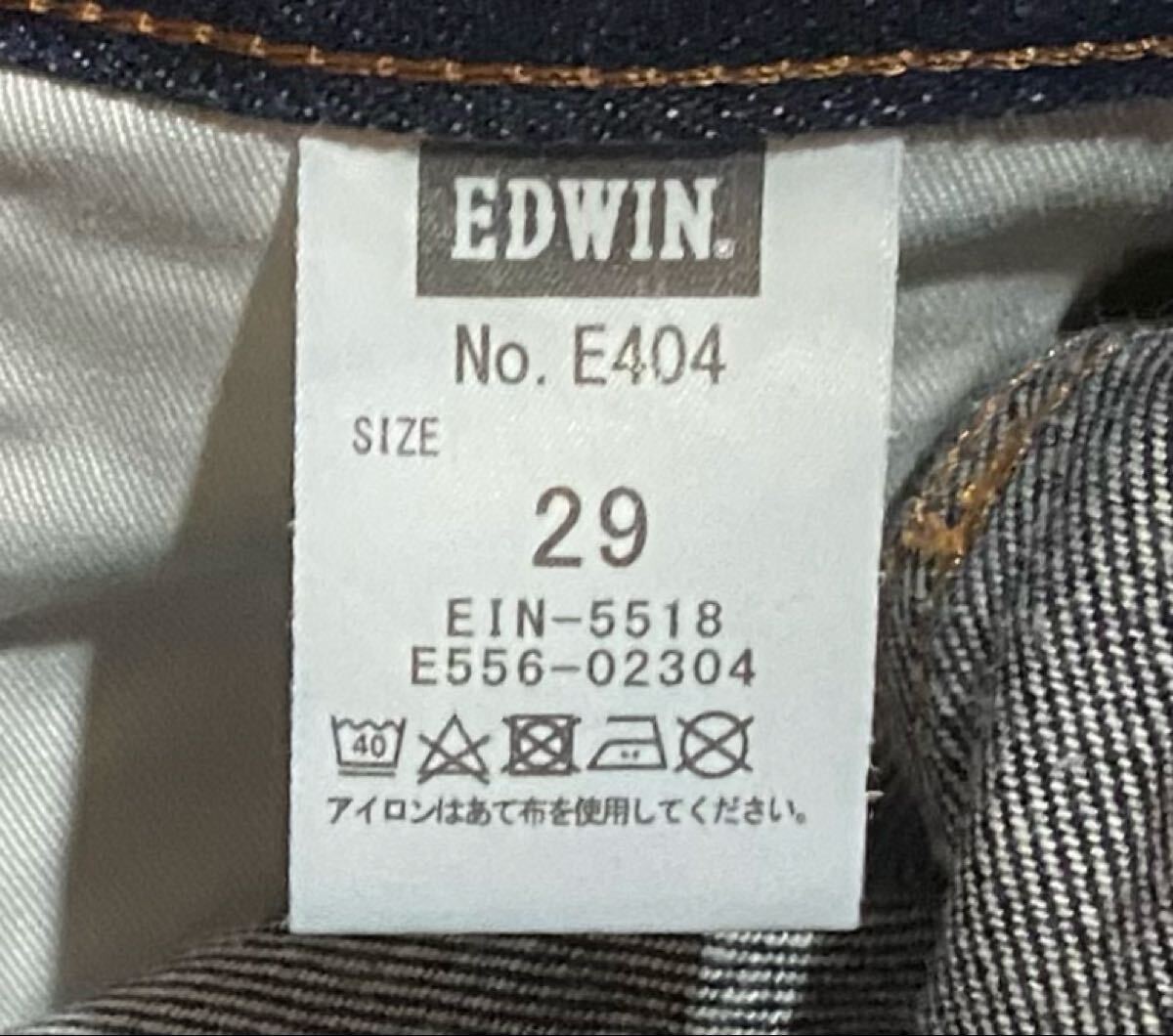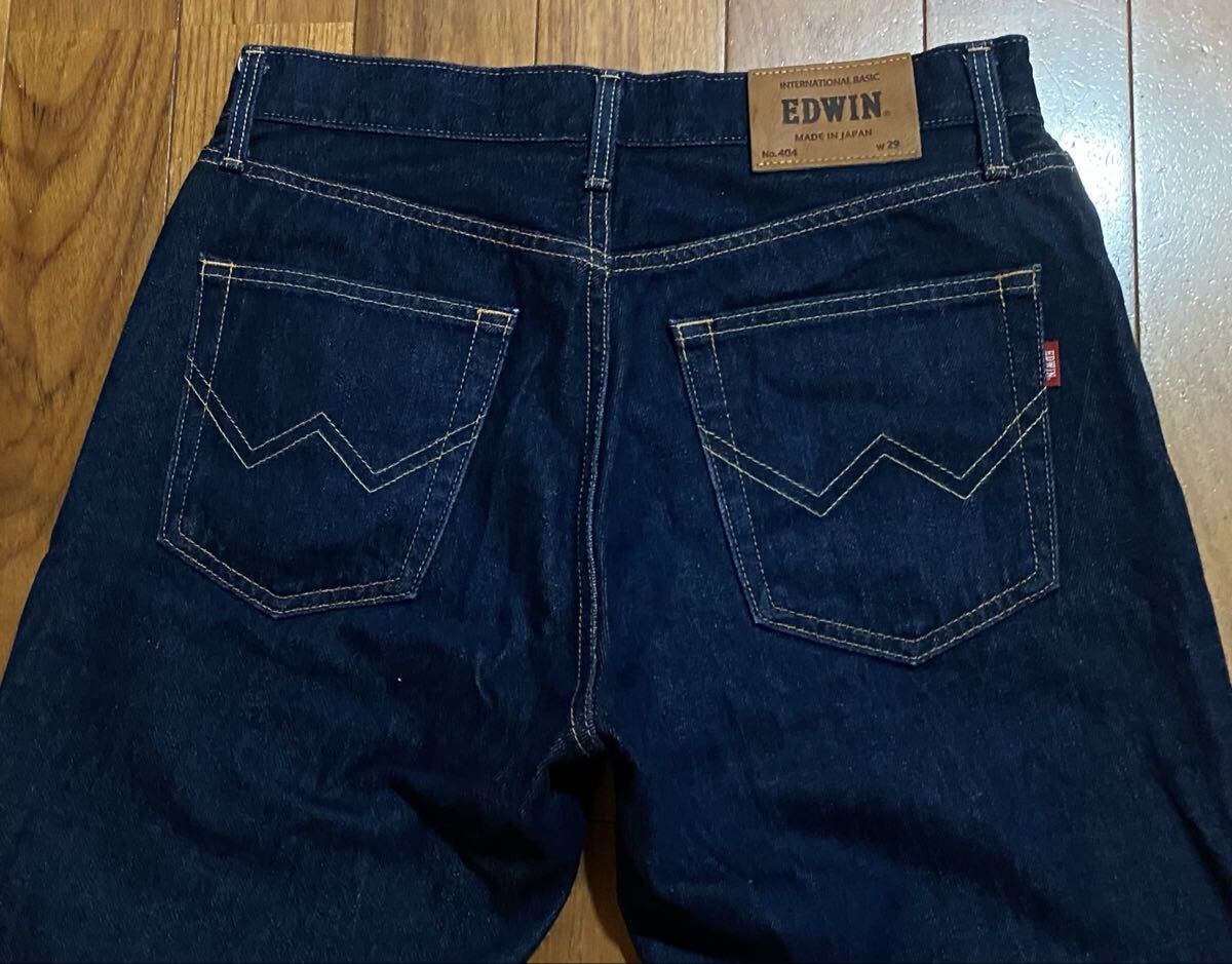 エドウィンのデニム(ジーンズ)、No.E404です。色はインディゴブルーです。USEDですが良いです(10段階中8程度)。生地は100%です。牛革パッチ、ジッパーフライ、裾はチェーンステッチです。正規品です((株)エドウイン、日本製)。サイズはW29でウエストは重ねずに平置きで約76cm、ヒップ約101cm、股上約26cm、股下約86cm、股下15cmのふともも部分約54cm、裾まわり約40cm、重量約700gです。発送はゆうパケットポストになります。