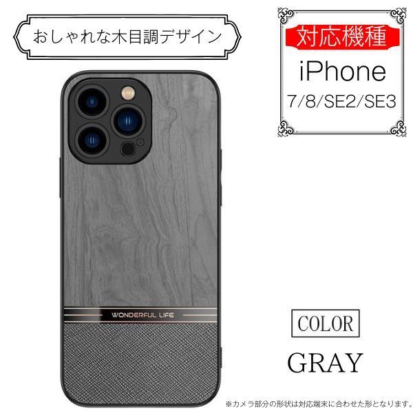 | 商品名 | iPhone 7/8/SE2/SE3 用 スマホケース 新品 PUレザー ソフト 耐衝撃 アイフォン 携帯 ジャケット シンプル 木目 グレー |
