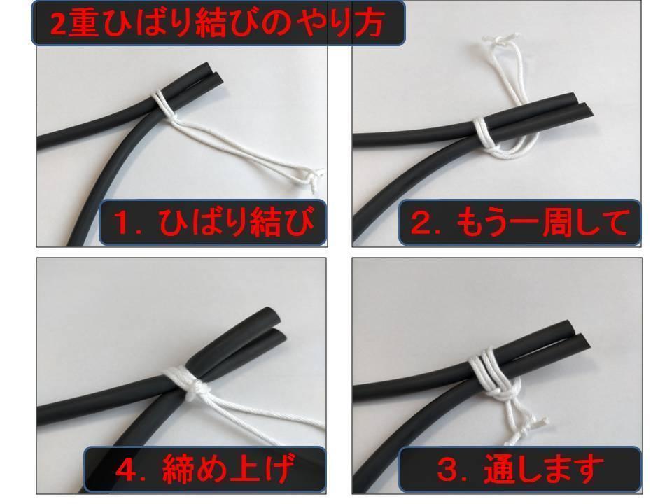 ・ひばり結び・・おすすめです。ウィッシュボンが不要になります。作り方を写真に入れてます。工程の1~4のうち「1」の1重ひばり結びですと、外れる事がありますがほどき易いので長さを調整する時に使えます。1重ひばり結びでも足で踏んで締め上げるとなかなか外れません。テストには十分です。