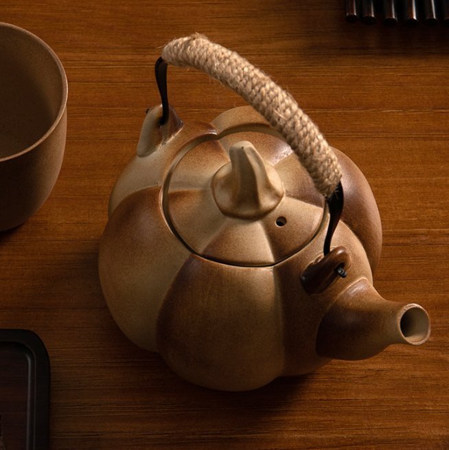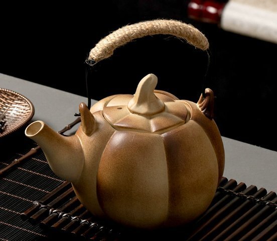 陶器の急須、耐熱囲炉裏でお茶を煮る漢方薬、屋外のヤカン、防爆カボチャの急須でお茶を煮る