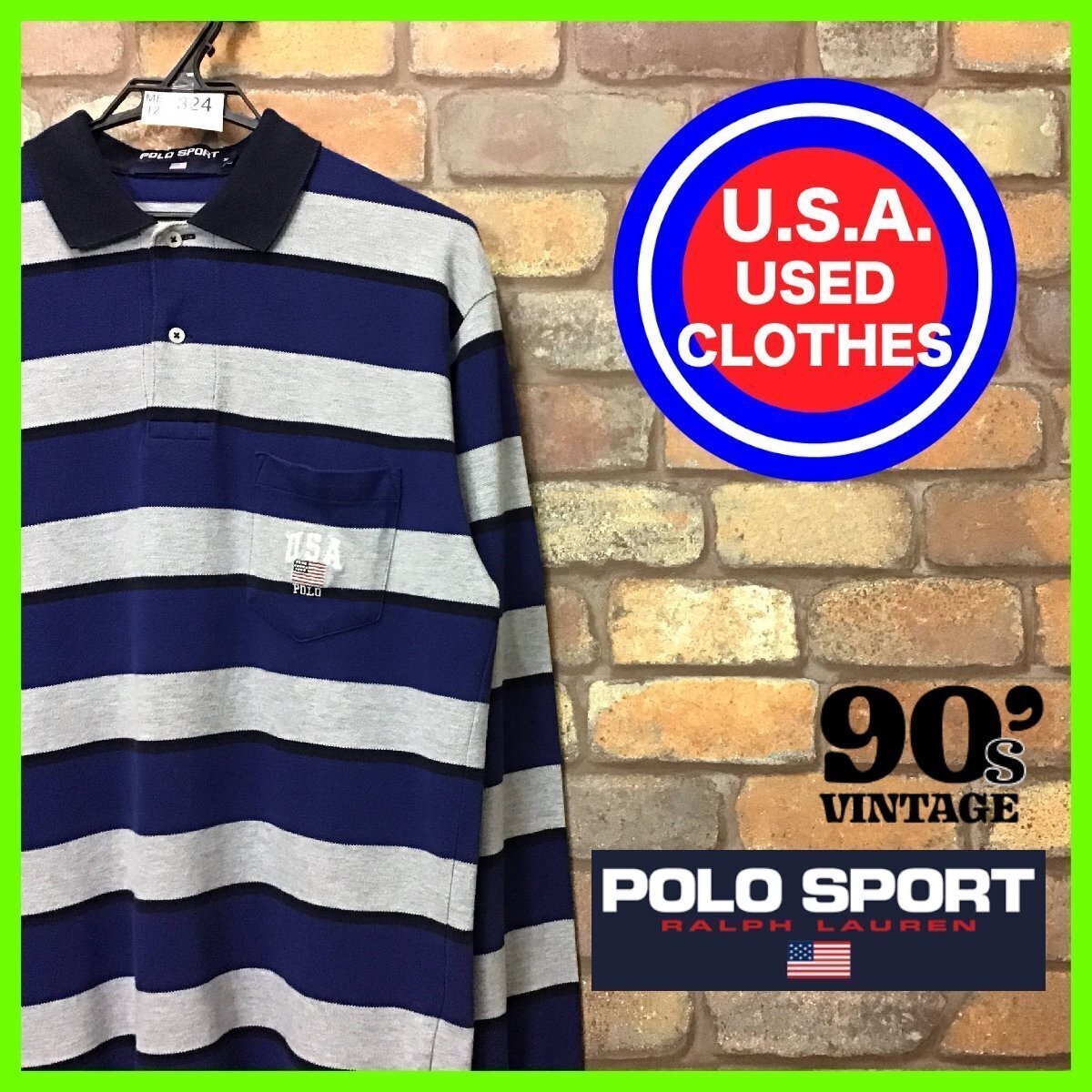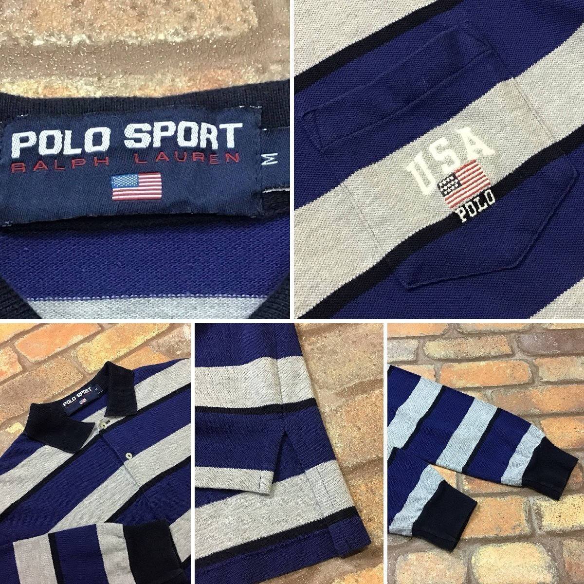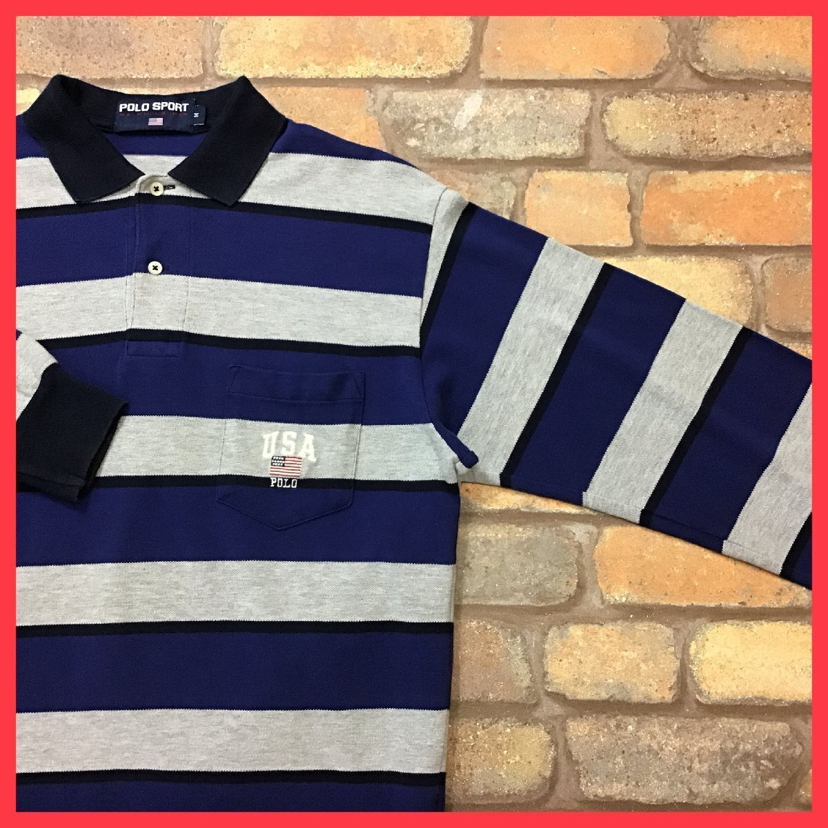 ME12-324★USA古着★90's VINTAGE★【POLO SPORTS ラルフローレン】刺繍ロゴ ボーダー ポロシャツ【メンズ M】紺×グレー 長袖 アメカジ