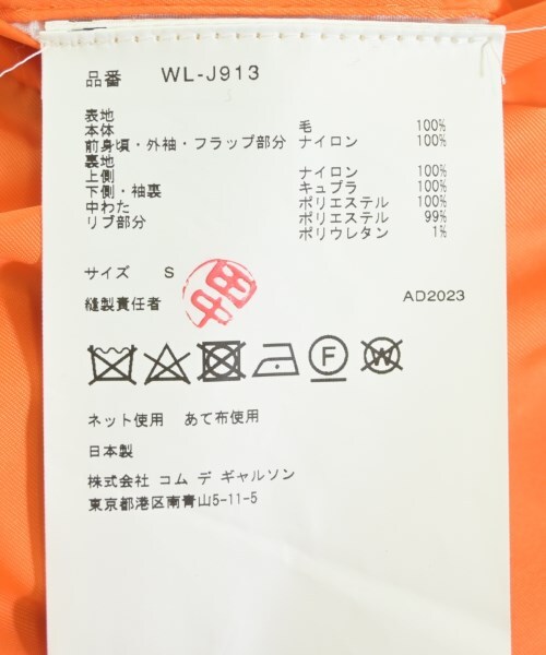 | 毛100%、(前身頃、外袖、部分、裏地上側)ナイロン100%、(裏地下側、袖裏)キュプラ100%、(中綿)ポリエステル100%、(リブ)ポリエステル99%、ポリウレタン1% |