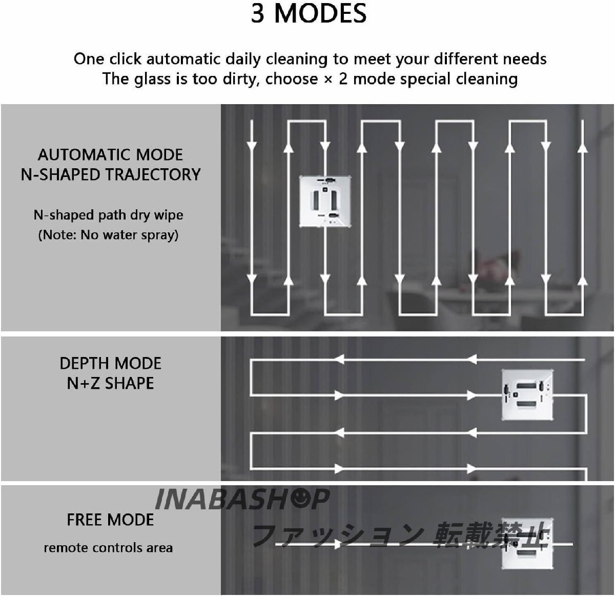 【インテリジェントな清掃】インテリジェントなルート計画、Zタイプ、Nタイプ、N/Zタイプの3つの窓清掃モード、3000Paの強力な吸引力により、ロボットがガラス表面を吸い込んで立ち上がるのを助け、包括的かつ迅速な清掃を実現します。エッジ検出センサーを内蔵したお掃除ロボットです。フレームレスガラスを縞や水滴なしで洗浄します。