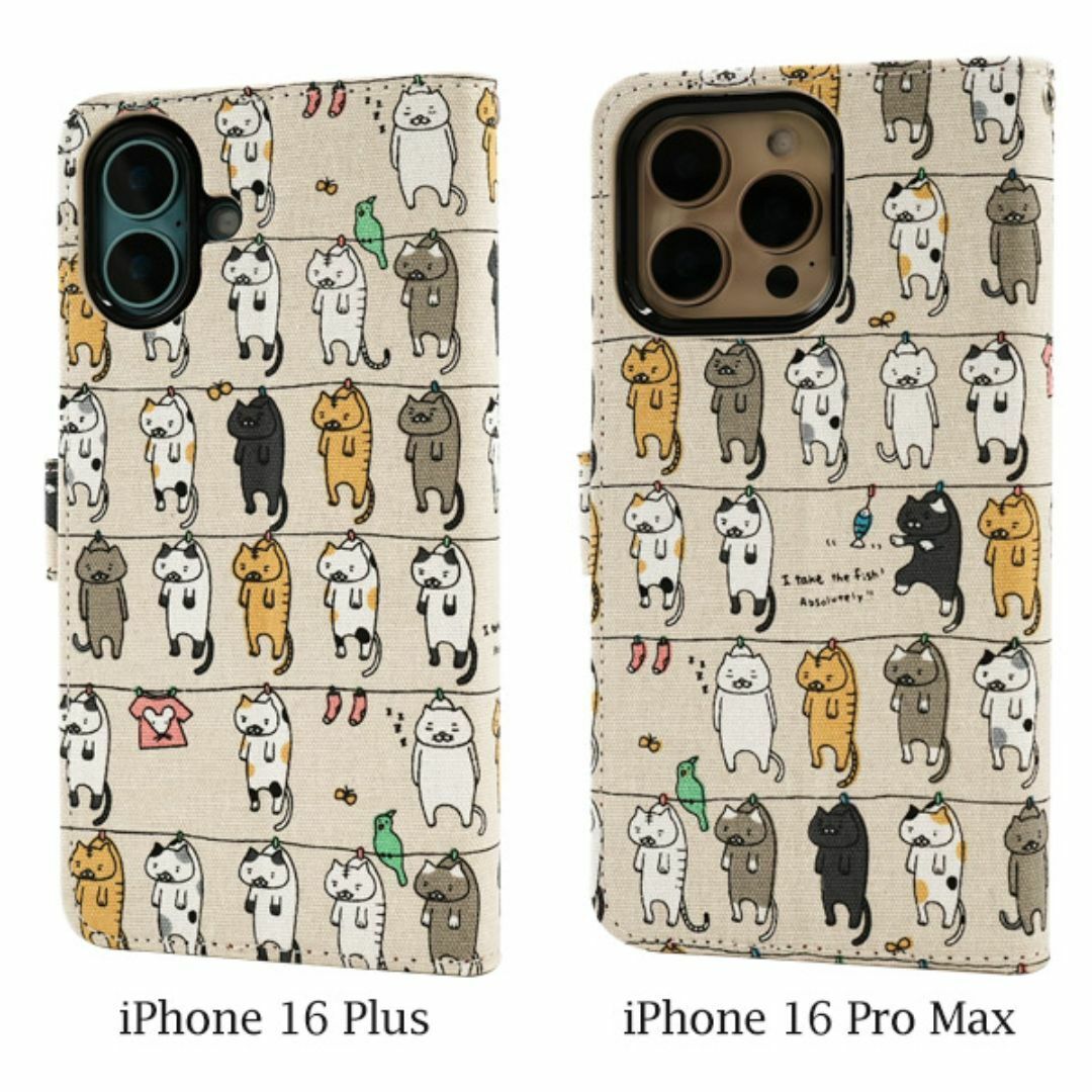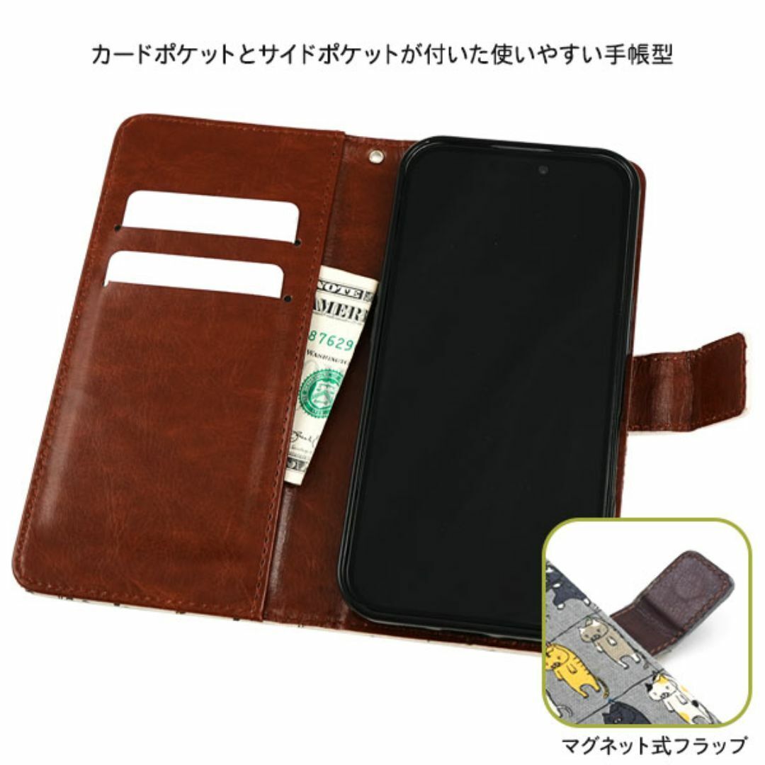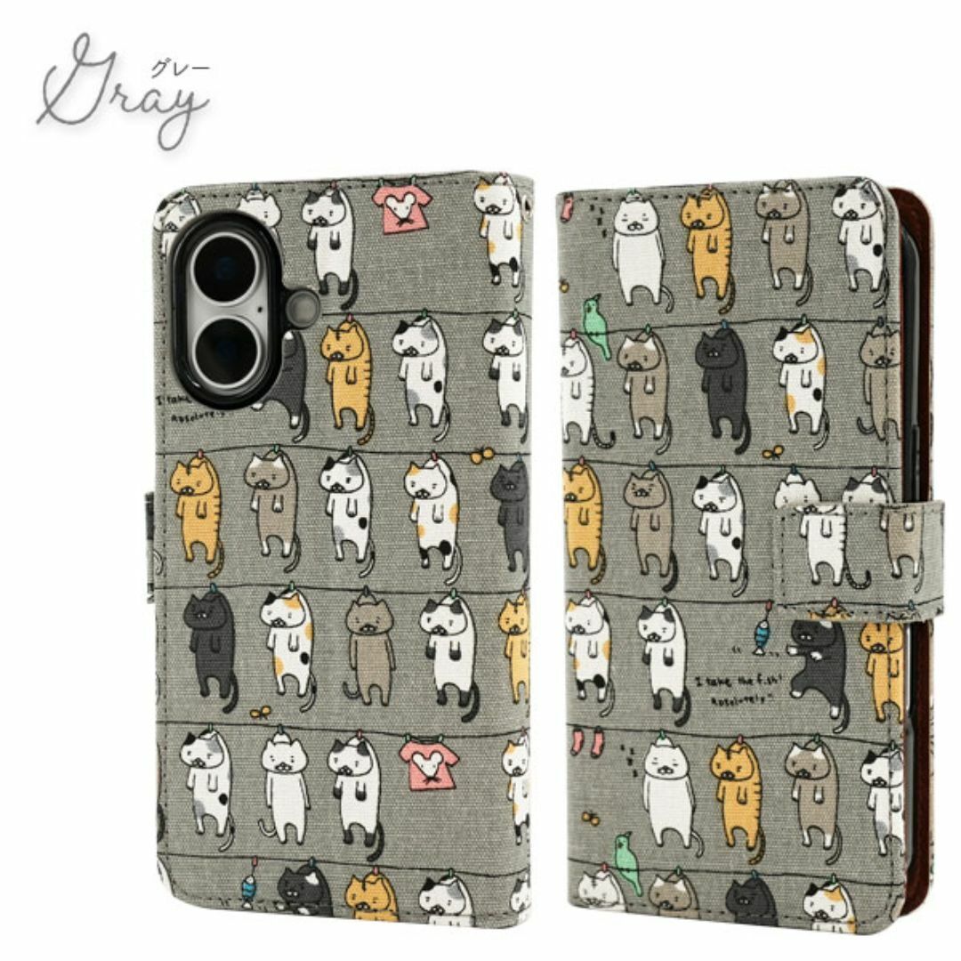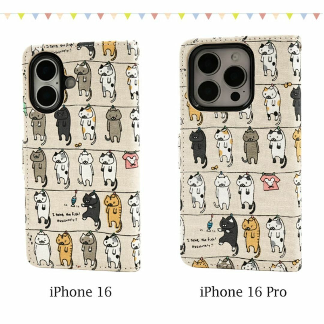 いっぱいの猫達が干されている柄の手帳型ケースです。