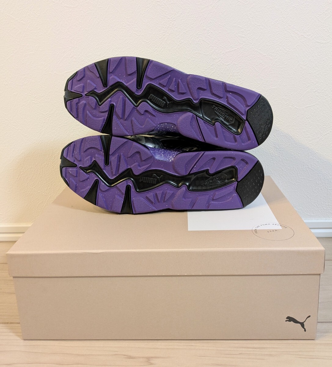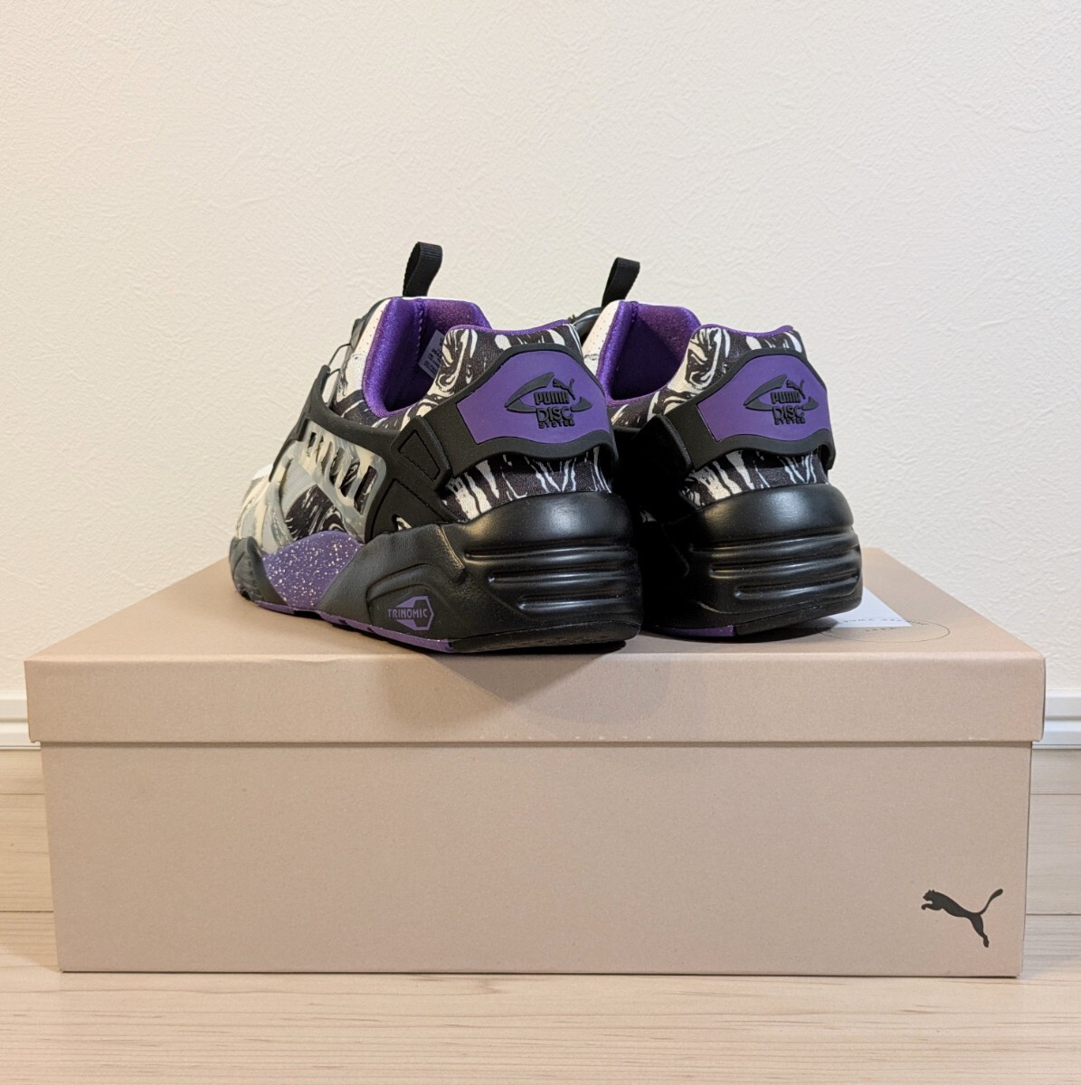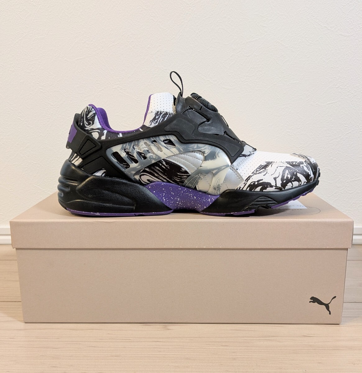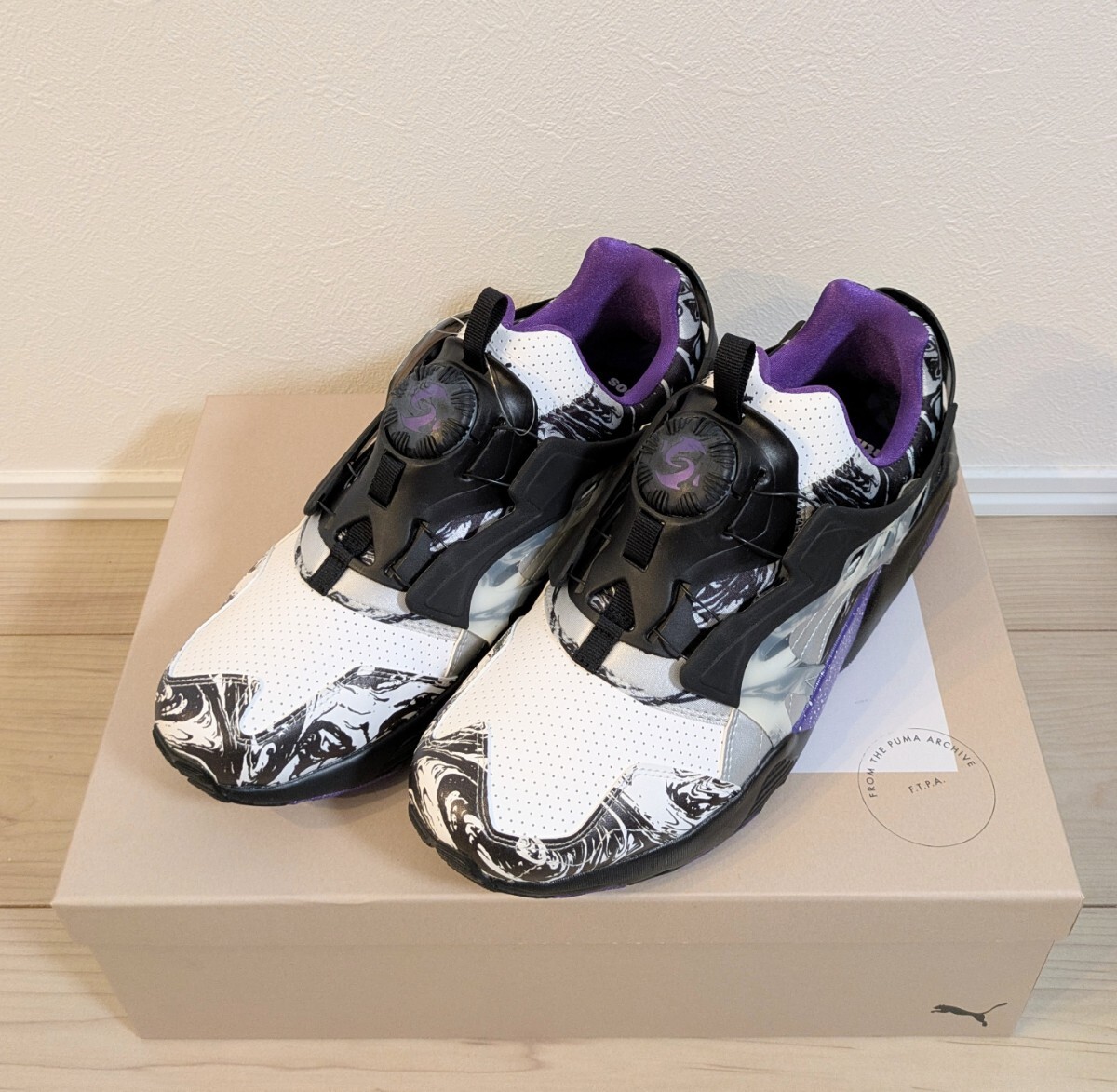「PUMA」のハイテクモデルの代名詞であるDISC BLAZEが30周年のメモリアルを迎え「atmos」との別注モデルです。足の甲に付属したディスクダイヤルでフィッティングが調整できる革新的なテクノロジーを搭載。さらに、ソールにはハニカム構造によるトライノミック機能で高品質な履き心地を実現した90年代の次世代モデルです。“墨流し”とは、1000年以上の歴史を持つ古の伝統芸術。水面に波紋状に広がる墨は環境によって異なる表情を作り出す偶発的なアートです。今回その“墨流し”模様を人気書芸家として活躍する赤間紫動氏が手掛けた和モダンなDISK BLAZEがラインナップ。ホワイトベースのアッパーのパーツに“墨流し”をあしらい、アクセントとして高貴なパープルカラーを注入。インソールには、コラボの証として両者のロゴを備えています。