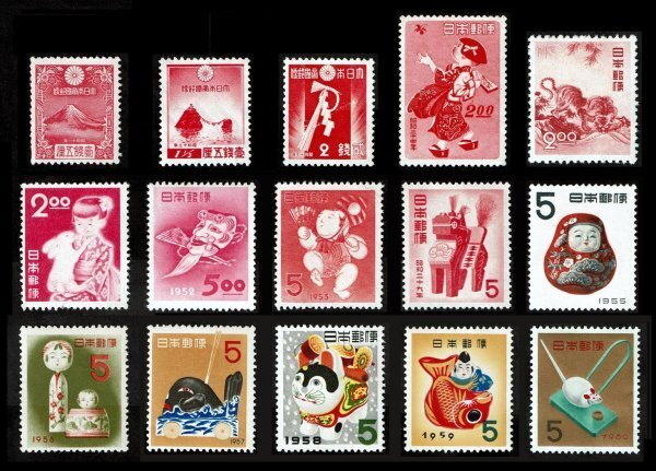 N756■【糊落ち】年賀切手 バラ 1936年~1960年 15種■未使用・良好