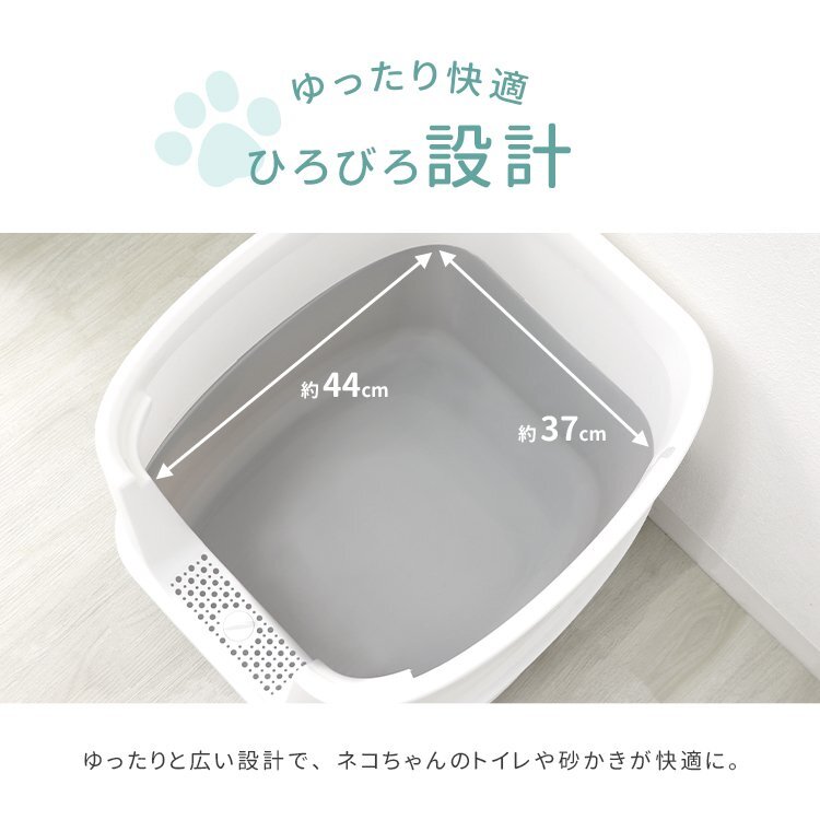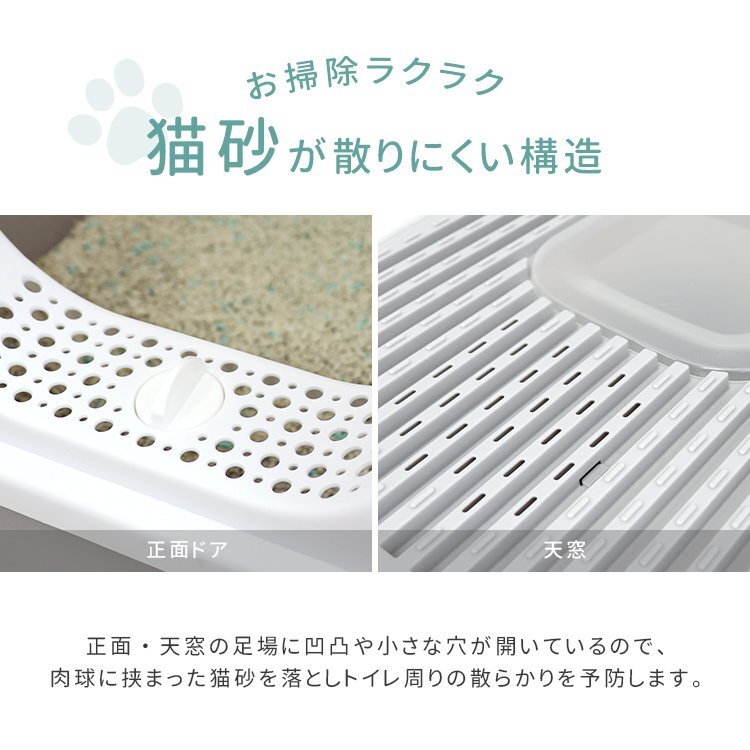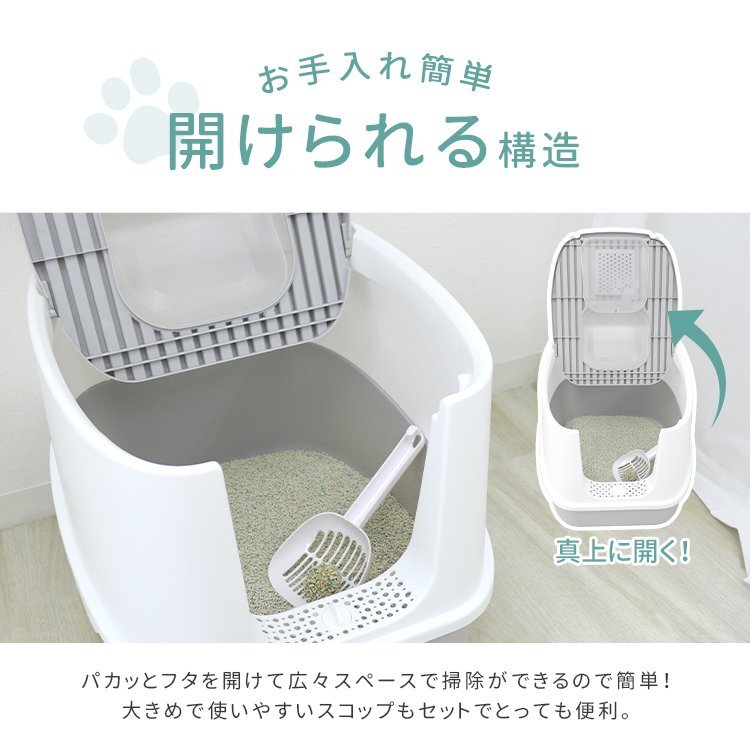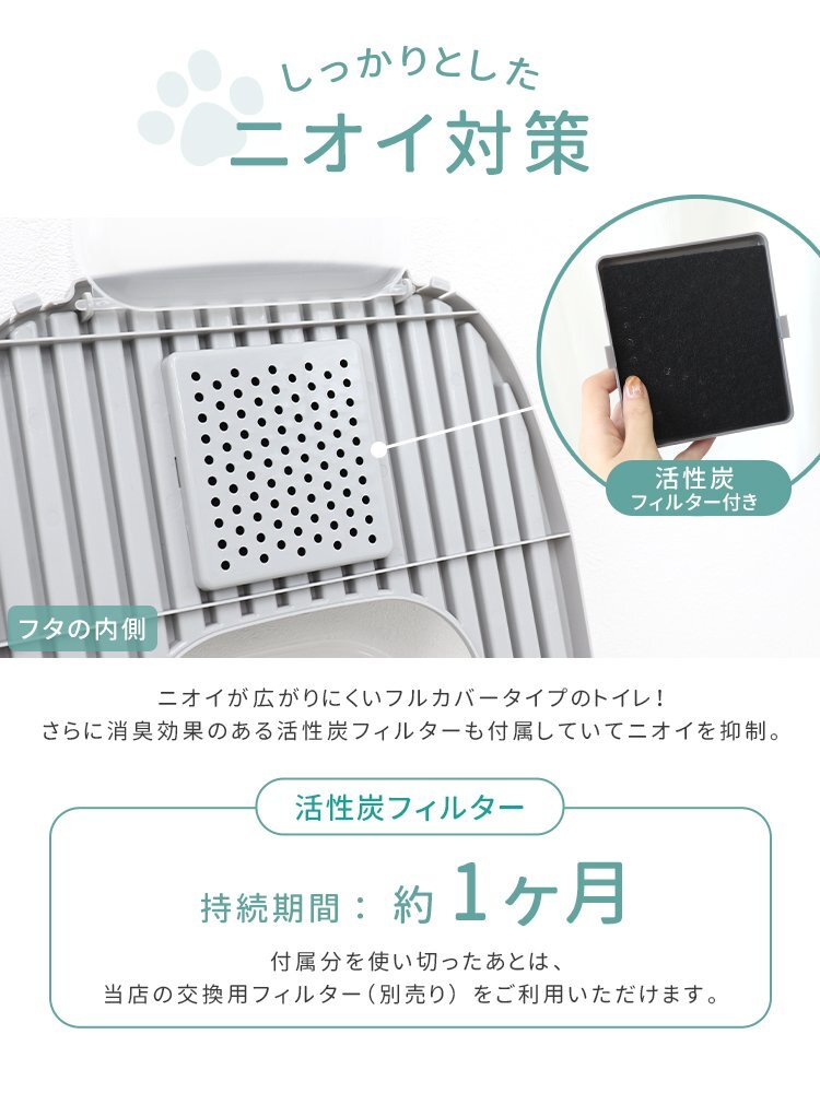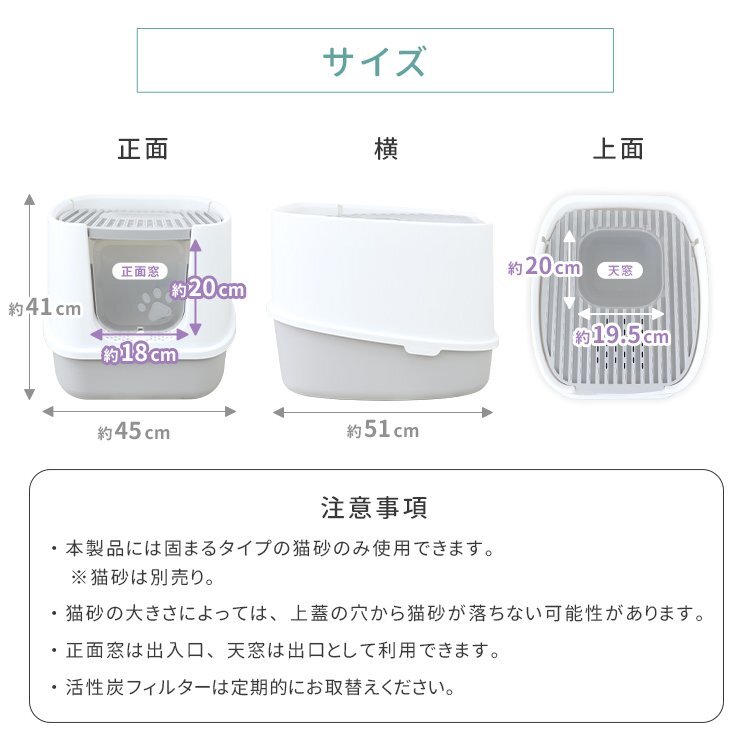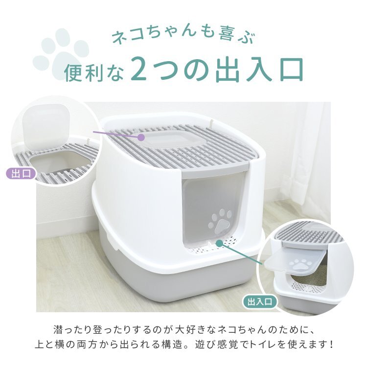 猫ちゃんは潜ったり登ったりが大好き! 横だけでなく、上の穴からも出られる構造!! 遊び感覚で楽しみながらトイレを使えます。 ニオイが広がりにくい「扉付き」です。 さらにニオイを抑える活性炭フィルターケース付で、ニオイ対策もバッチリです!! 広々設計なので、大型の猫ちゃんでも快適にお使いいただけます! また、天板にも扉が付いており、出口を天窓のみに絞れば猫砂の飛散を防ぐことができます。 お手入簡単!上からフタを開けてお掃除できちゃう♪ お掃除には欠かせない、専用のスコップが付きで、使わない時は本体に掛けて収納可能☆ 【商品仕様】 カラー:グレー サイズ(約):W45×H41×D51cm 重量(約):約1.8kg 【商品内容】 トイレ本体 スコップ ヘラ 活性炭フィルター 取扱説明書 |