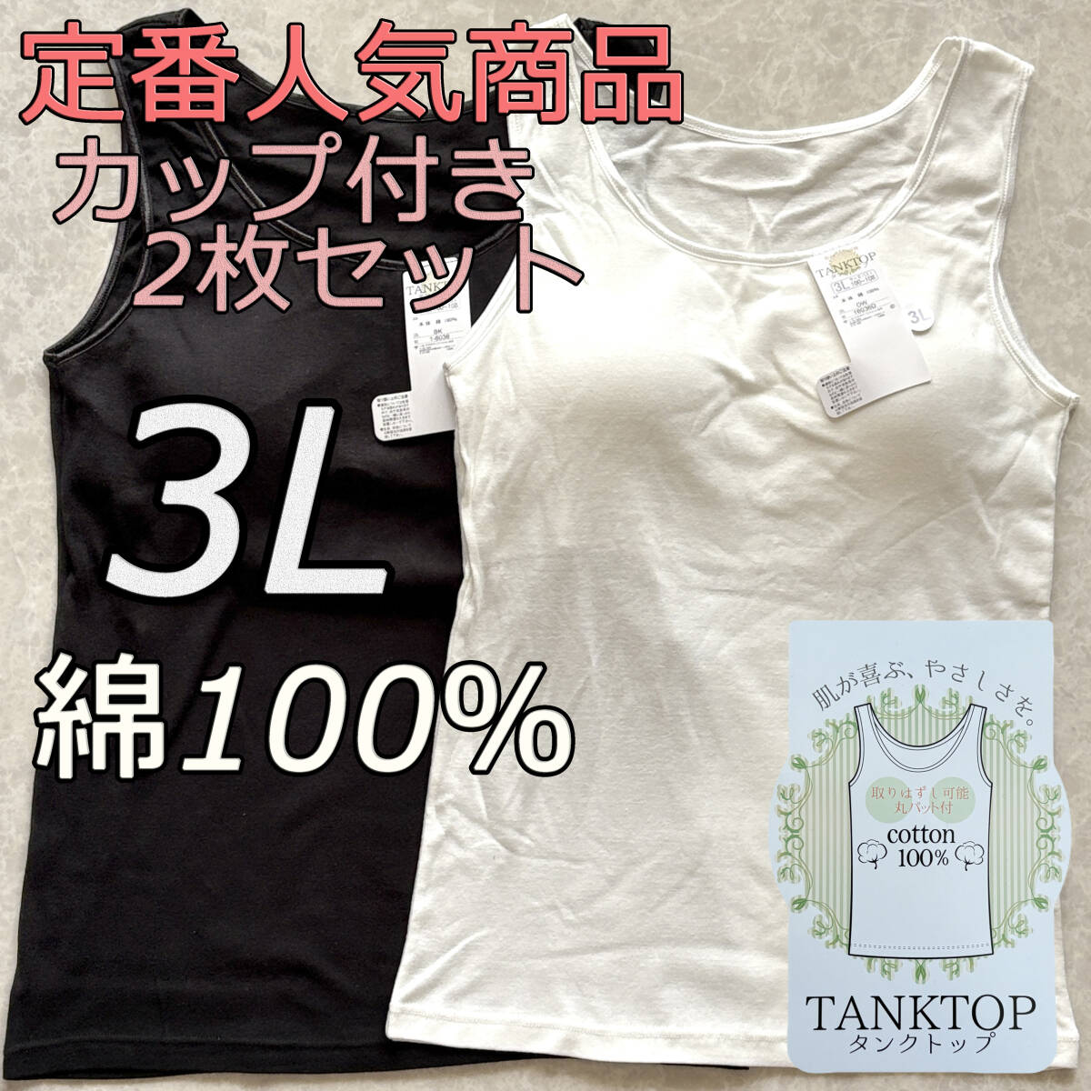レディース 3L 2枚組 綿100% カップ付き タンクトップ ブラトップ インナー ノンワイヤー 肌着 ルームウェア ブラジャー スポブラ wb