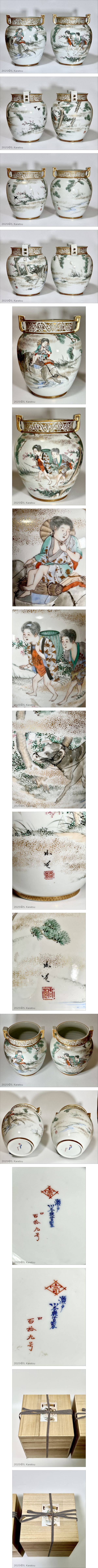 | 商品説明 | 明治期瀬戸の美術陶磁の先駆者となった初代川本桝吉の牧童図花瓶一対を出品致します。絵付けは、画工ではなく、本画家の安井如苞によるものです。銘は、「瀬戸川本桝吉製」という珍しい銘です。その銘と並んで、大日本七宝会社の銘「宗」があります。大日本七宝会社は、明治4年に愛知七宝会社として設立されました。七宝会社という名称ながら、実際には七宝製品だけでなく、陶胎七宝や陶磁器なども扱っていたようです。陶磁器の場合には本作のように磁体を瀬戸の川本桝吉などから仕入れており、上絵付けは個々の画家・井村商店・森村組・竹内忠兵衛などに委託していました。本作では、大日本七宝会社の横に「ロ 百拾九号」という出品番号が記されていますから、欧米の展示会や博覧会などに出品された作品であることがわかります。 安井如苞は明治24年頃に瀬戸から島根に移り、若山陶器試験場の専属画家になっていますから、本作は明治24年よりも前に製作されたものということになります。本作はオランダで入手したものですが、明治22年にはパリ万博が開催されていますから、そこへ出品されたのではないかと思われます。 さて、本作は高さ28cmですが、幅が20cmもありますので非常に大きく見えます。ワレやカケ、ヒビなどの瑕疵はありません。金彩の擦れなども殆どなく、写真でご覧の通り非常に良い保存状態です。ほぼ新品と言っても過言ではありません。川本桝吉の優品が市場に出る機会は殆どありません。 趣味で、明治陶磁器に関するブログを書いていますので、ご覧頂ければ幸いです。 https://karatsu.hatenadiary.com/ また、Pinterestにコレクションをアップロードしていますので、併せてご覧頂ければ幸いです。 |