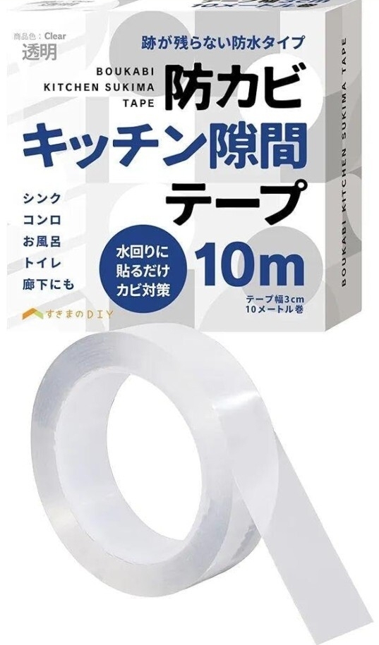 マスキングテープ 防カビ 透明 防カビ防水 台所コーナー コンロの隙間 キッチン すきまテープ カビ汚れ防止 補修 防水 防油 強粘着 耐熱 のり残らず 繰り返し 台所 キッチン お風呂 バスルーム 浴槽まわり 洗面台用など (30mmx10m)
