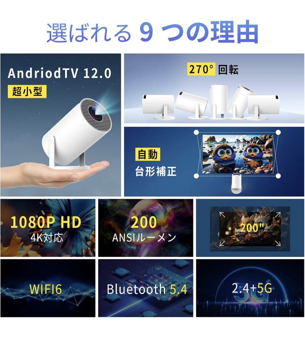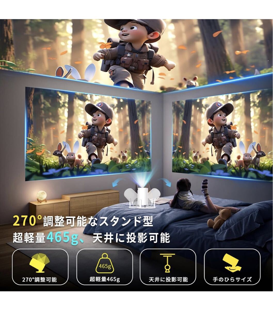 プロジェクター 家庭用 【12025最新進化AndroidTV搭載 ・18000LM・270°回転・4K対応】 接続Bluetooth5.4 1080P高輝度 自動台形補正 短距離投影 プロジェクター 小型 ホームプロジェクター Wi-Fi6瞬時接続 内蔵HiFiスピーカー 天井投影 APP利用可能IOS/Android/パソコン/DVD/PS機/SWITCH接続可 日本語取扱説明書