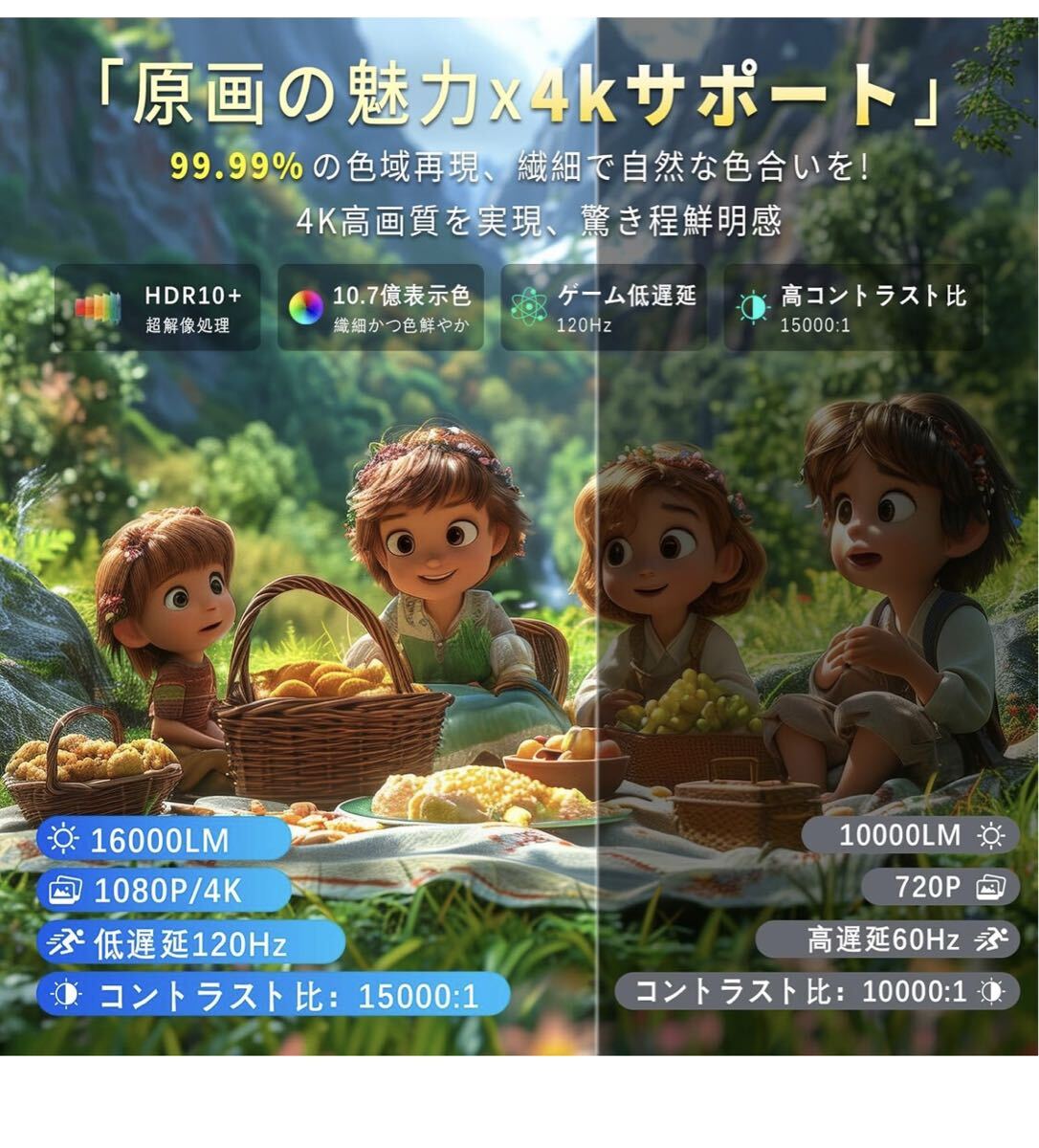 【18000ルーメン高輝度・1080P高解像度・4K対応】プロジェクターは 小型18000ルーメンに向上し、ネイティブ解像度は1080Pにアップグレードされ、NTSC色域の95%以上をカバーし、色再現性が高く、投影された画像は鮮明で、元の色に近くなります。プロジェクターはスクリーンなしで白い壁に直接投影することができ、自然な形で詳細な色を再現し、美しい画像を楽しむことができます。優れた12,000:1のコントラスト比を最大限に引き出します。4Kソースも兼用して、綺麗な再生が楽しめます。ホームシアター、スポーツ観戦に最適で、自宅でも高画質な映像を楽しめます。