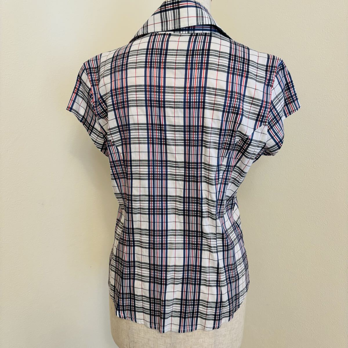 爽やかなチェック柄とフリルデザインが目を引く半袖ブラウスです。ホワイトベースにネイビー&レッドのラインが映え、上品かつ華やかな印象に。フロントの縦フリルが縦ラインを強調し、スタイルアップ効果も期待できます(。・・。)