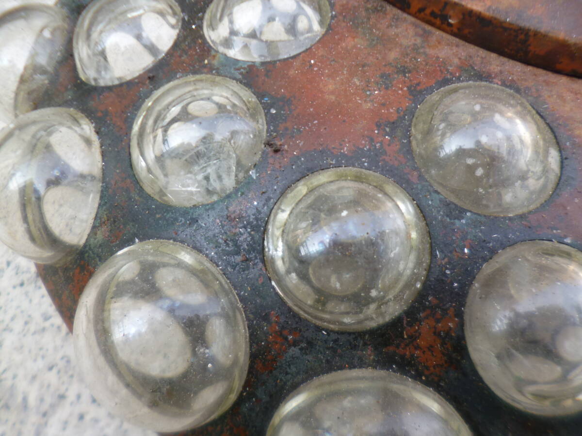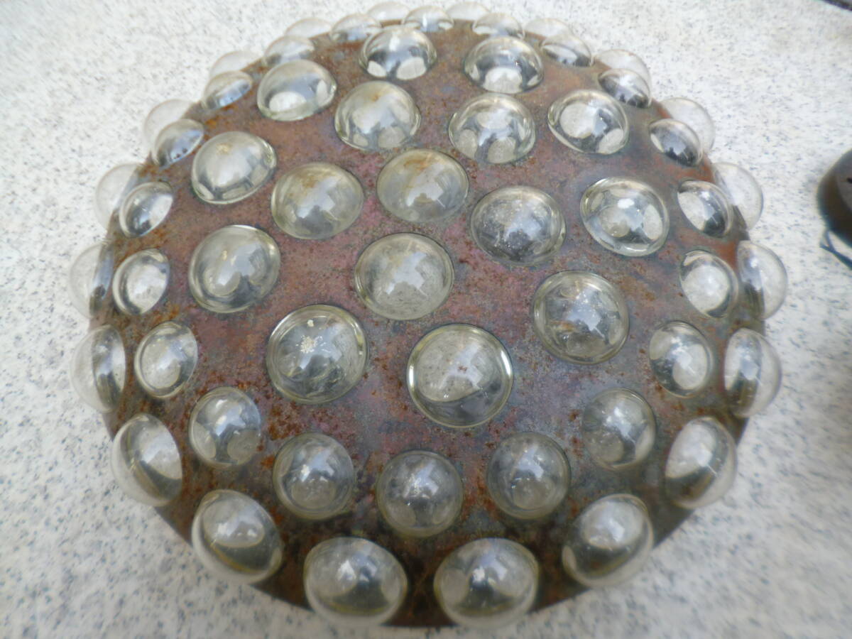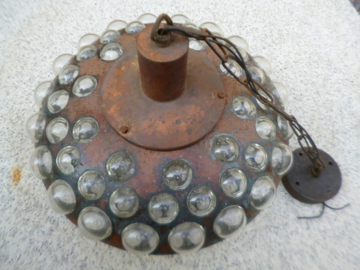 ■とても古い店舗で使用していた天井吊り下げの照明で楕円形球体のスチール製(鉄)で半円型のガラスが多数付いてる照明器具です。スチール部分に長年のサビ・汚れがありガラス部分も汚れがあります■