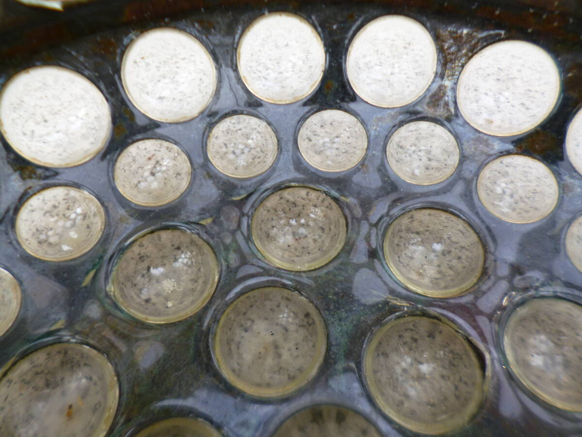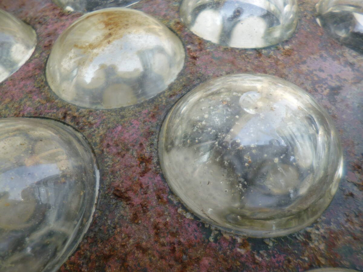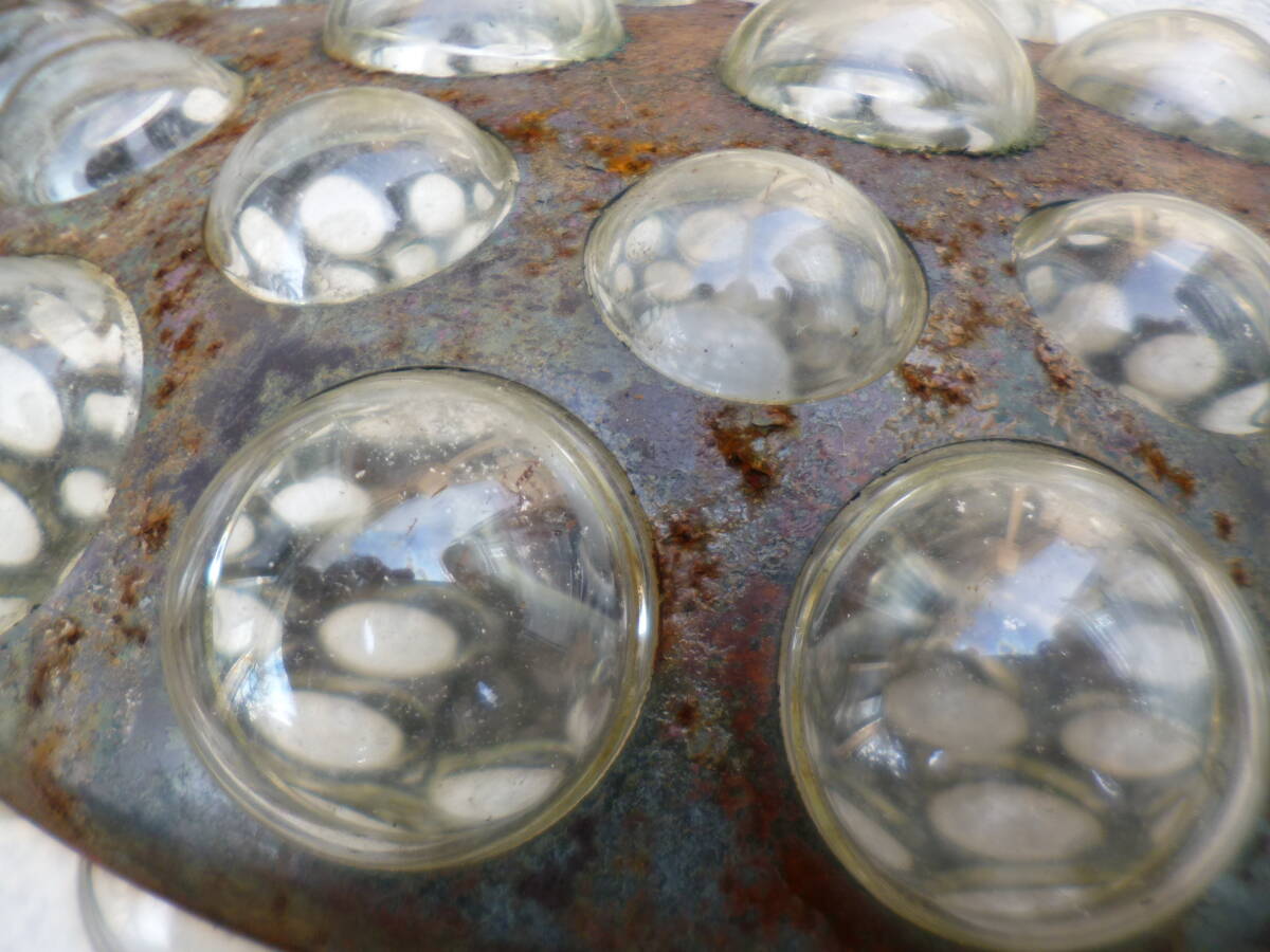 ■とても古い店舗で使用していた天井吊り下げの照明で楕円形球体のスチール製(鉄)で半円型のガラスが多数付いてる照明器具です。スチール部分に長年のサビ・汚れがありガラス部分も汚れがあります■