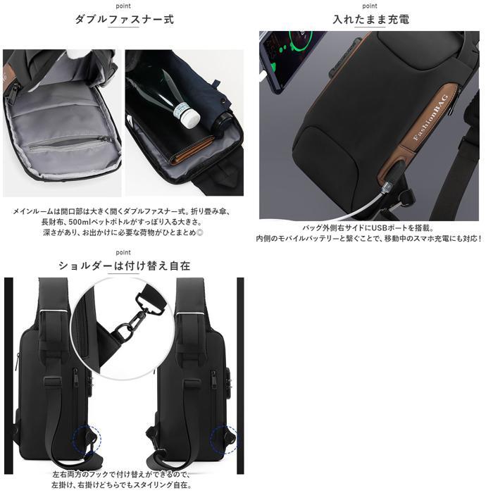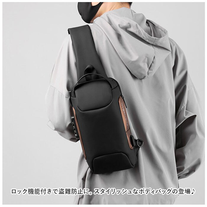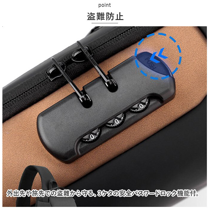 商品説明 | ・・ロック機能付きで盗難防止に。スタイリッシュなボディバッグの登場♪ ・【盗難防止】 ・外出先や旅先での盗難から守る、3ケタの安全パスワードロック機能付。 ・【ダブルファスナー式】 ・メインルームは開口部は大きく開くダブルファスナー式。折り畳み傘、長財布、500mlペットボトルがすっぽり入る大きさ。深さがあり、お出かけに必要な荷物がひとまとめ◎ ・【入れたまま充電】 ・バッグ外側右サイドにUSBポートを搭載。内側のモバイルバッテリーと繋ぐことで、移動中のスマホ充電にも対応! ・【ショルダーは付け替え自在】 ・左右両方のフックで付け替えができるので、左掛け、右掛けどちらでもスタイリング自在。 ・【雨・汚れに強い】 ・ボディにははっ水性の高い生地を使用しているため、突然の通り雨にあった時でも水滴や汚れがサッと拭き取れる!(※完全防水ではございません。ご注意ください。) ・【ベーシックカラー&デザイン】 ・コーディネートを選ばないカラー展開。ベーシックなデザインで大人だけでなく、お子さまにも使いやすく、デイリーや旅行など様々なシーンで活躍。 ・【ポケット仕様】 ・[メインルーム内側]オープンポケット×2、ファスナーポケットX1 ・[サイド]ファスナーポケット×1 ・[バッグ背面]ファスナーポケット×1 |