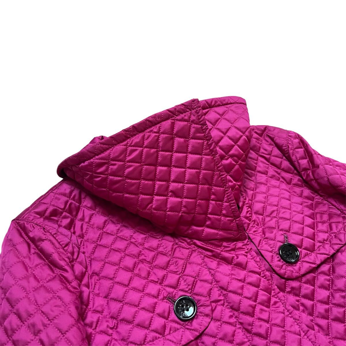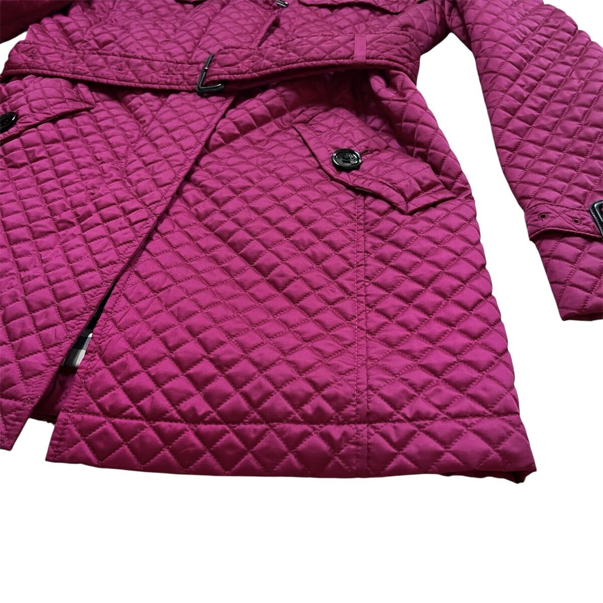 BURBERRYのマゼンタキルティングトレンチコート、ベルト付きでスタイリッシュ。