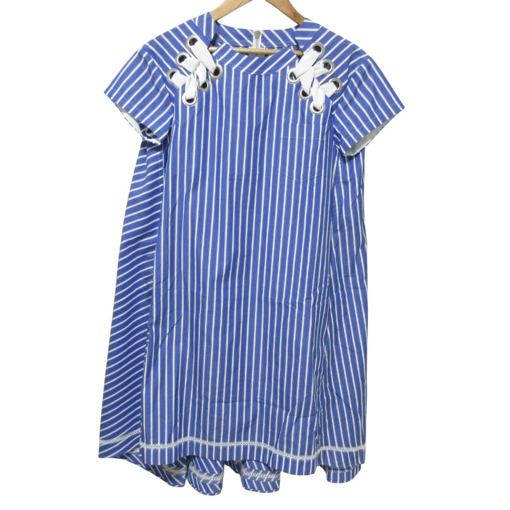美品 sacai サカイ ストライプ 半袖 膝丈 ポプリン ドレス ワンピース 18-03614 1 ブルー×ホワイト