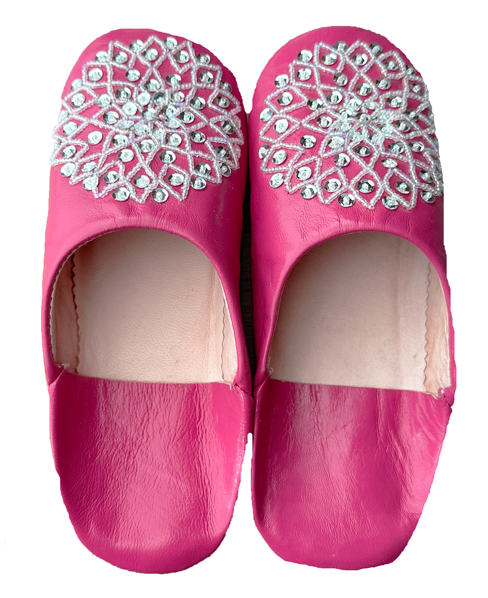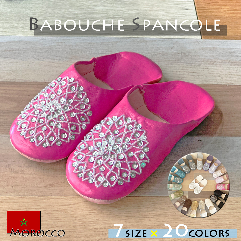 当店のバブーシュはすべてモロッコの職人さんが手作りで作製したものです。工場で作った大量コピー製品ではないので小さな傷・汚れ、染色の際のむら、ボンドのはみだし、ボールペンの跡、若干のサイズの誤差、同じデザインでも左右非対称、入荷時によって画像とのデザインやスパンコールの色の違いなどのハンドメイド感についてはご了承のうえ、ご注文をお願いいたします。上記のことを踏まえての価格設定となっております。