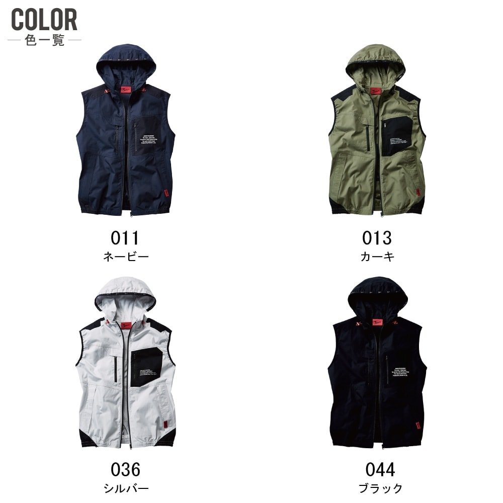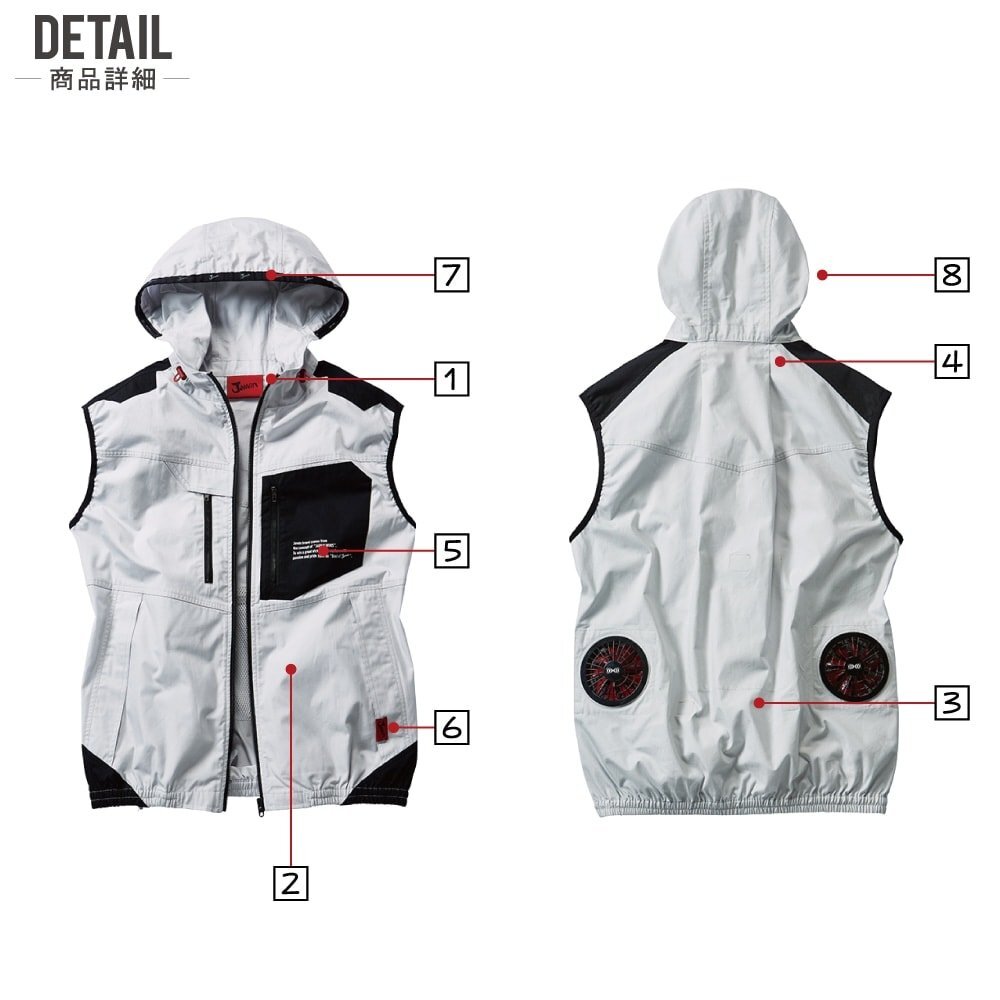 特長:調整紐(首元)/左内側パッテリー専用ポケット/保冷剤用メッシュポケット/首元タック入り/フードパンチング仕様