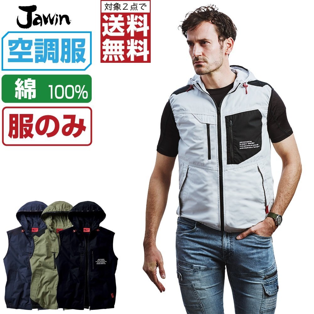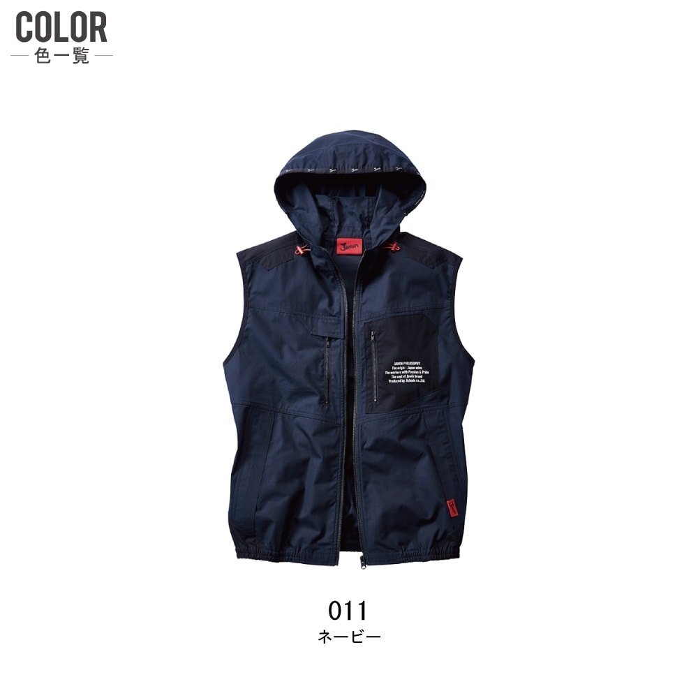 アウトドアテイストのデザインでハードワークにも適したフード付きの空調服ベスト。