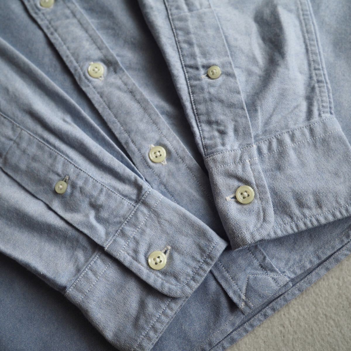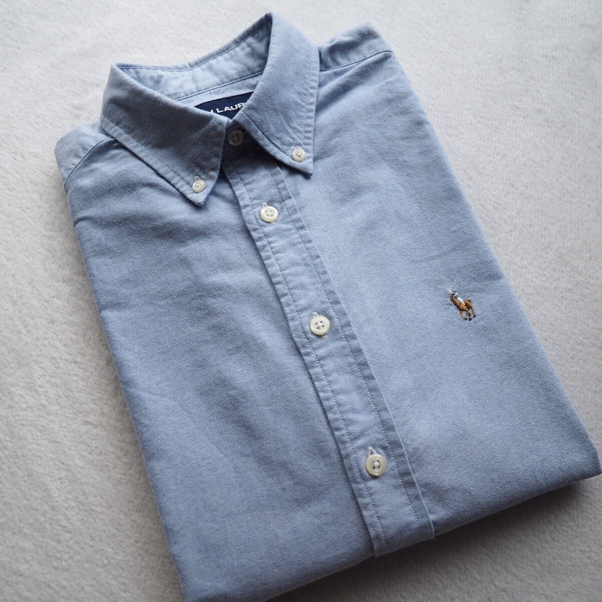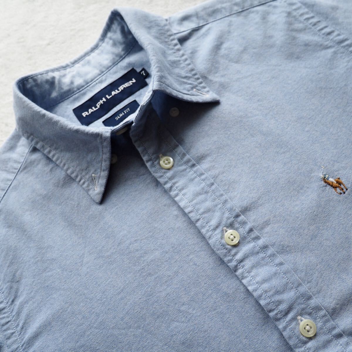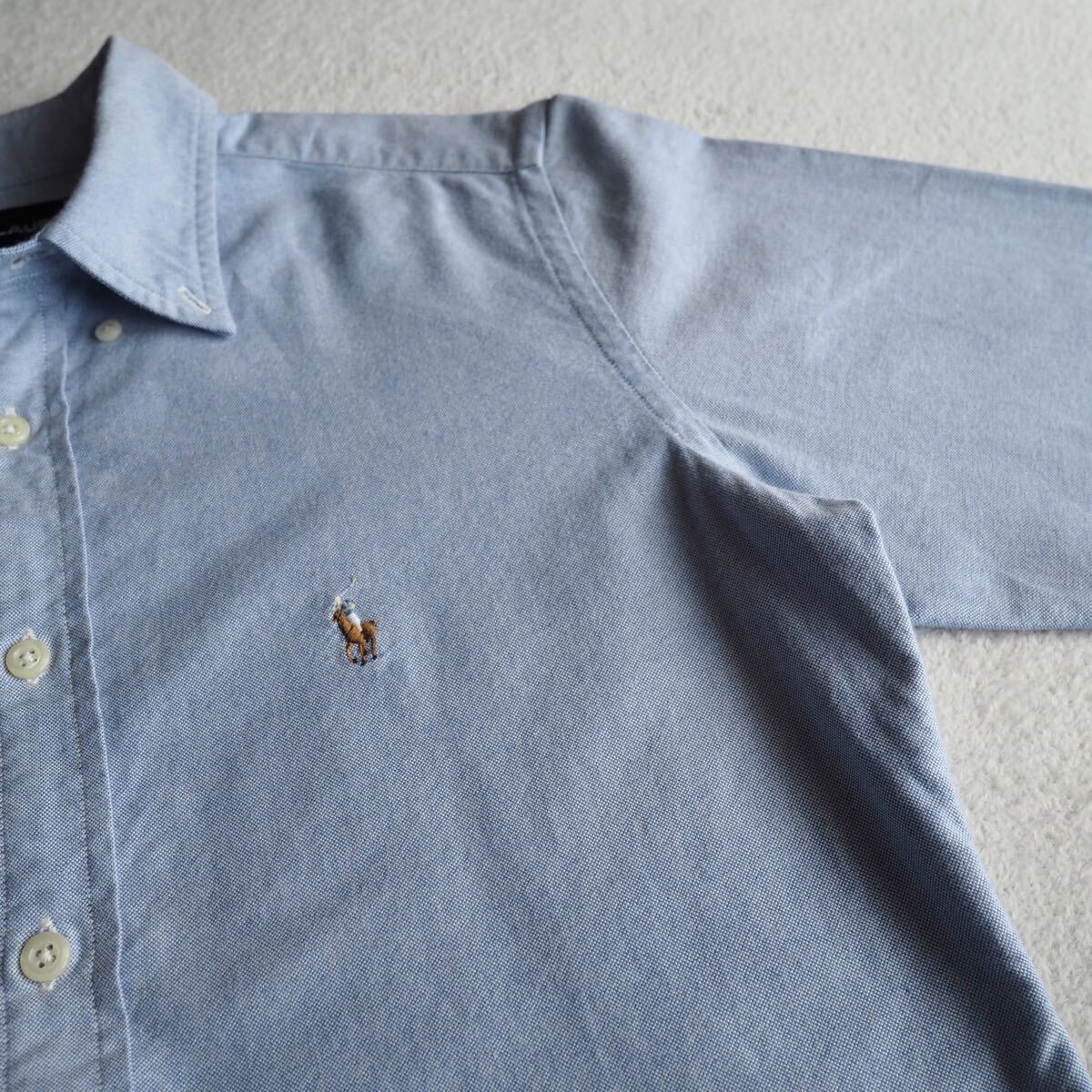 王道ベーシックなブルーシャツで、ボタンダウンの襟元に、胸元のマルチポニーがポイントとなっています。