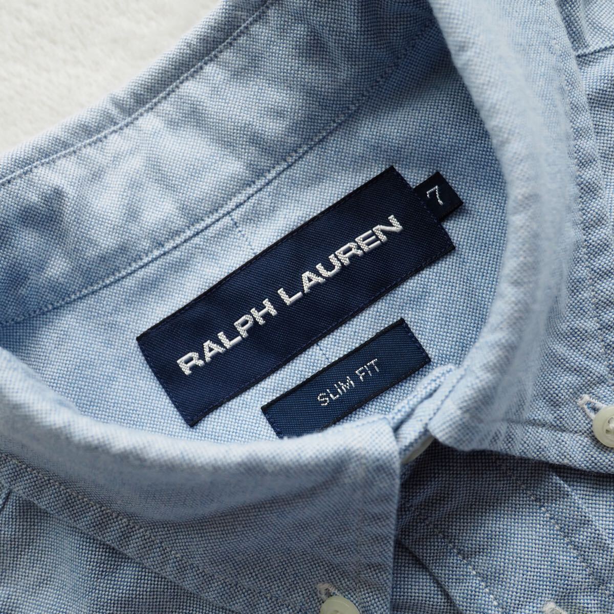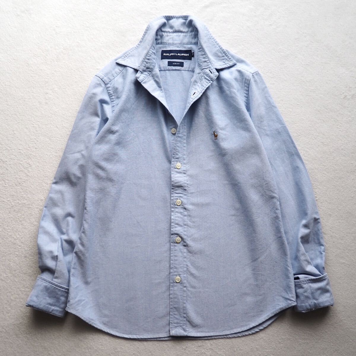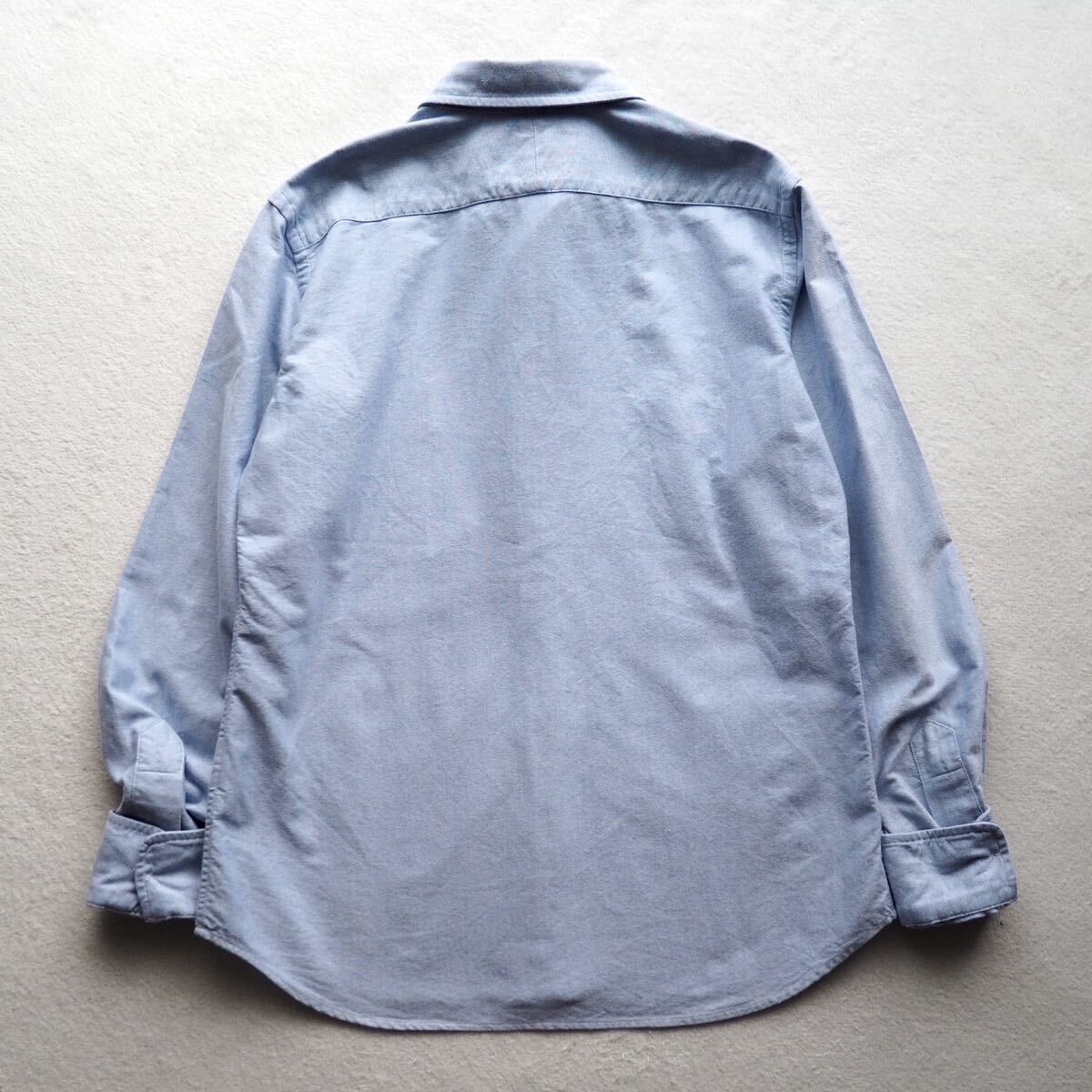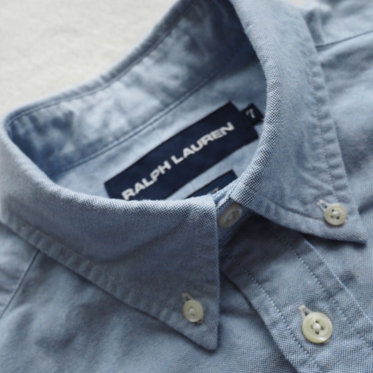 王道ベーシックなブルーシャツで、ボタンダウンの襟元に、胸元のマルチポニーがポイントとなっています。