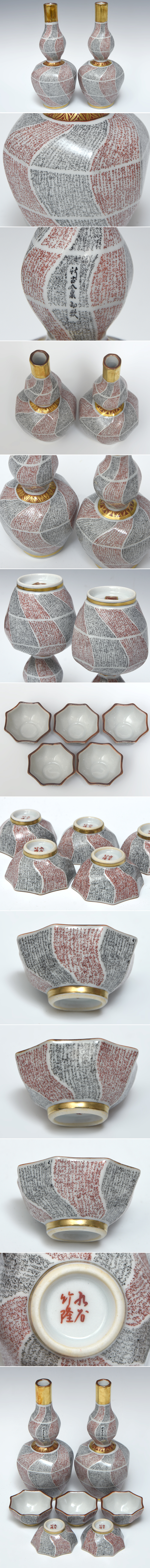 九谷 竹隆 / 北村隆(造)九谷焼 新古今和歌 御酒器揃 徳利2客 盃5客 共箱 猪口 酒器 酒盃 酒杯 陶磁器 |