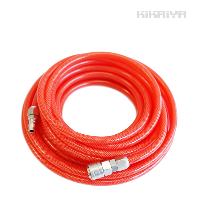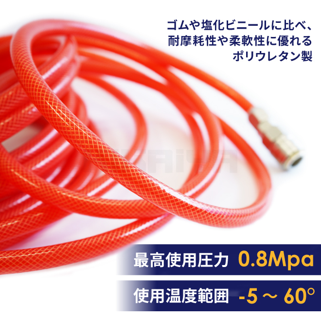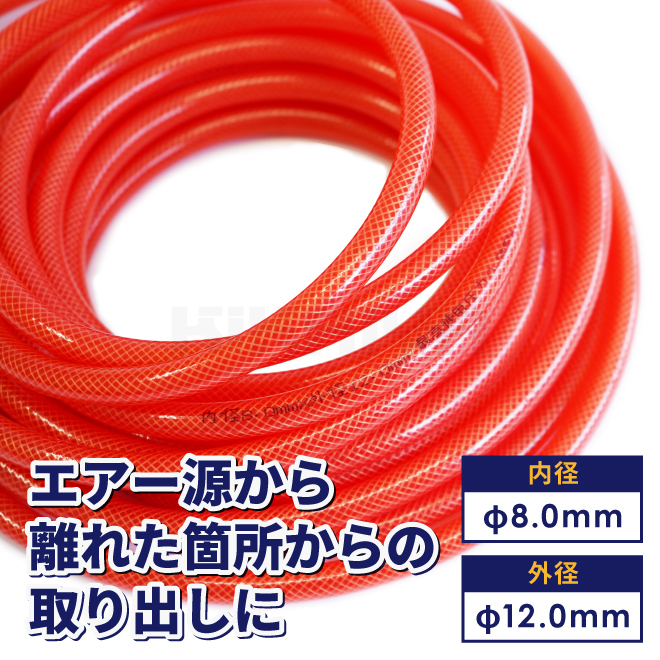 ●エアー源から離れた箇所からの取り出しに ●脱着簡単なワンタッチカプラー付 ●ゴムや塩化ビニールに比べ、耐摩耗性や柔軟性に優れるポリウレタン製 ●補強糸入りでねじれや折れに強く、硬化しづらい ●作業現場で目立つクリアレッド |