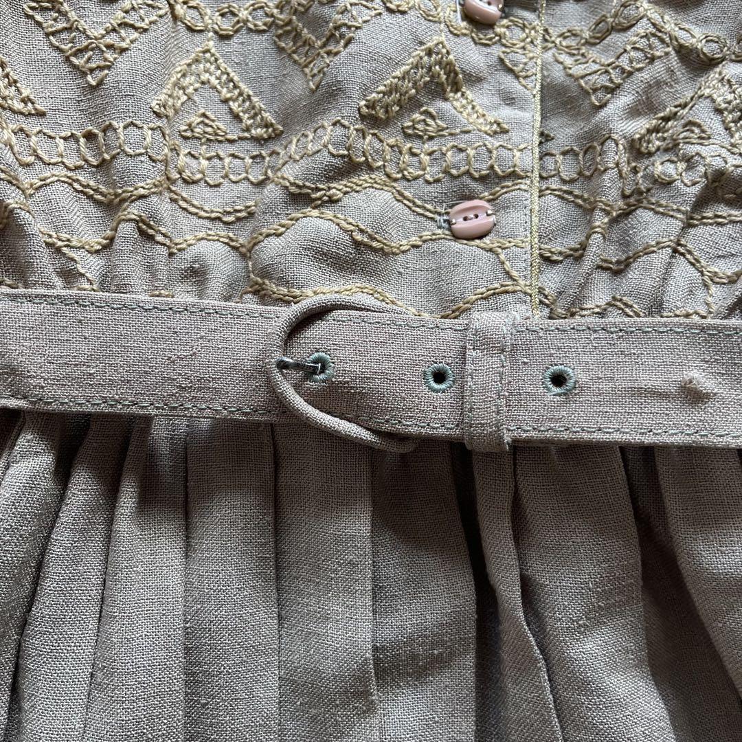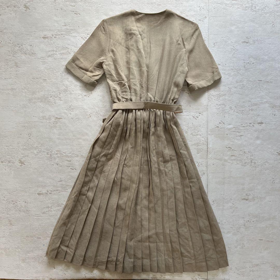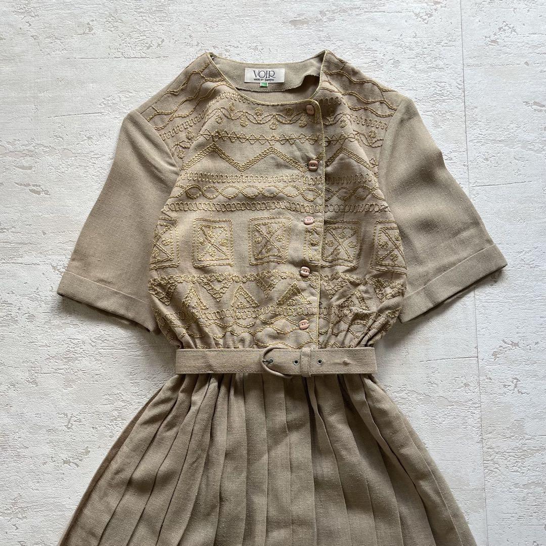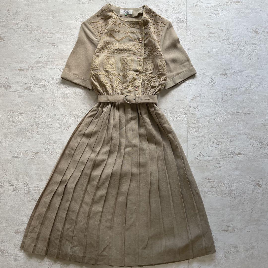 昭和レトロ ベージュ 刺繍 ワンピース ベルト付き 半袖 プリーツデザイン J2