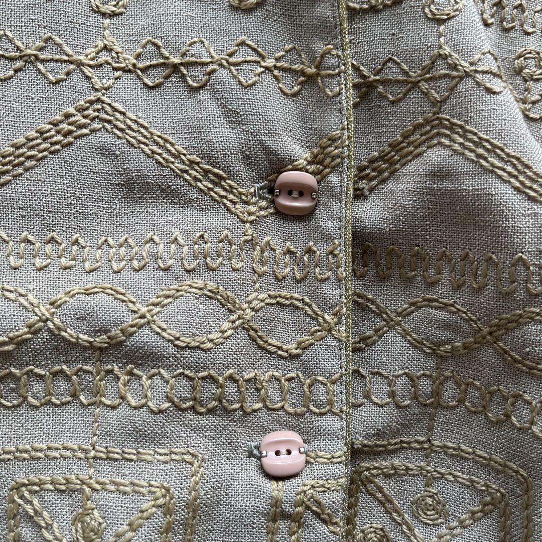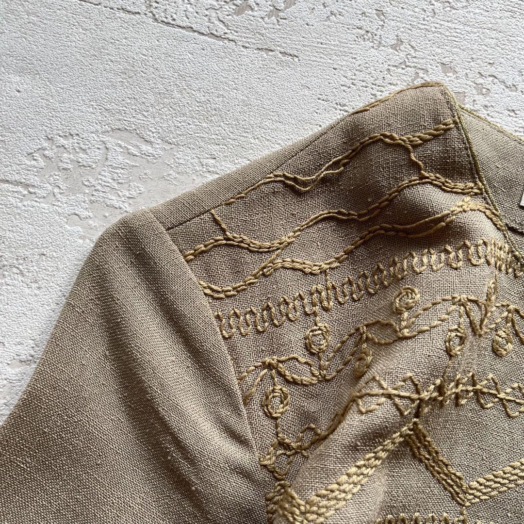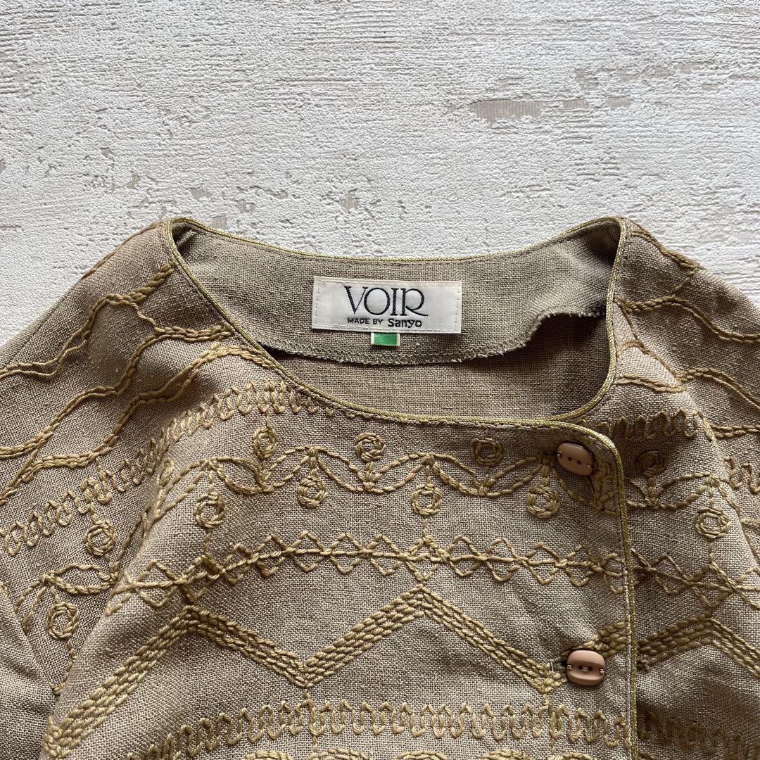 昭和レトロな雰囲気漂う、サンヨーブランド「VOIR」のヴィンテージワンピースです。落ち着いたベージュカラーに幾何学模様の刺繍が施され、ナチュラルで上品な印象を与えます。ウエスト部分はベルト付きでメリハリのあるシルエットを演出。プリーツスカートが女性らしく、普段使いはもちろん特別なお出かけにも活躍します。昭和レトロや古着コーデ、ヴィンテージ好きな方におすすめの一点物。春夏のコーディネートに取り入れると雰囲気がぐっと華やかになります。