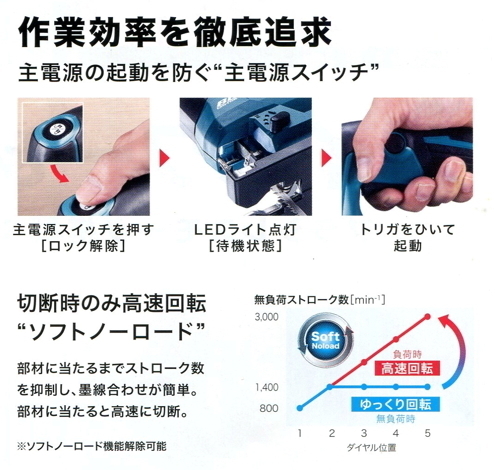 部材に当たるまでモータの回転を抑えるため 墨線合わせが容易。部材に当たると高速に切断。