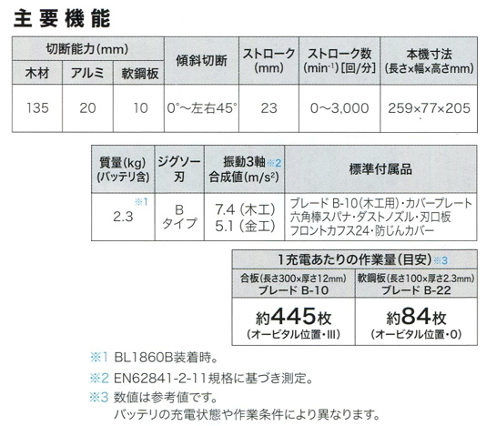 切断能力 木材135mm アルミ20mm 軟鋼材10mm