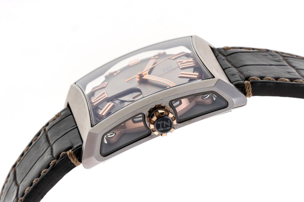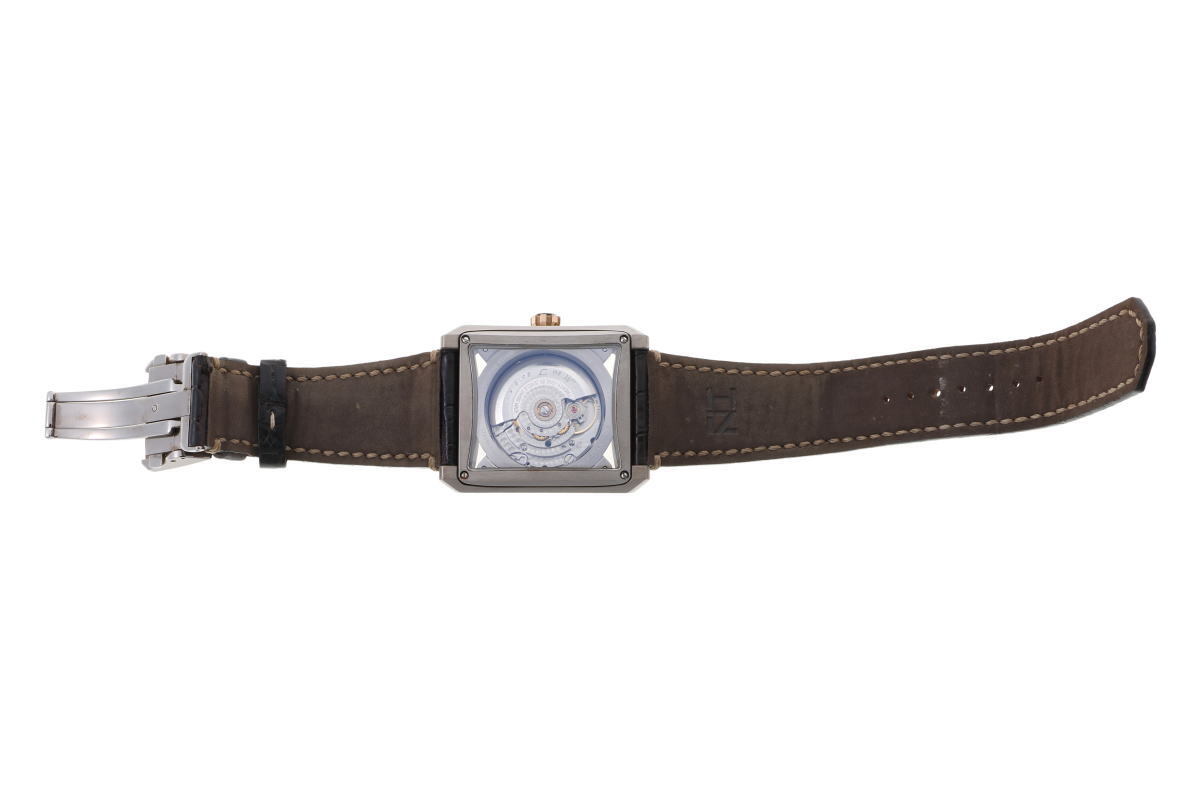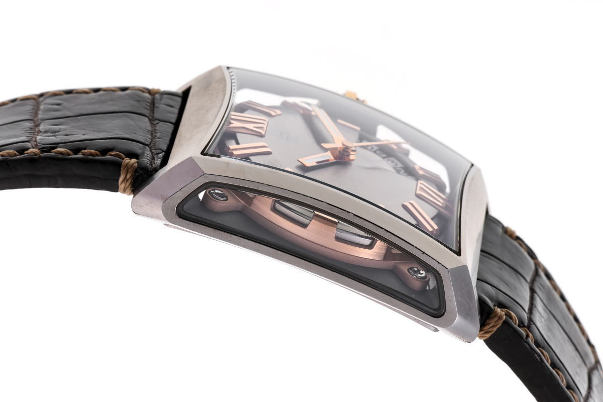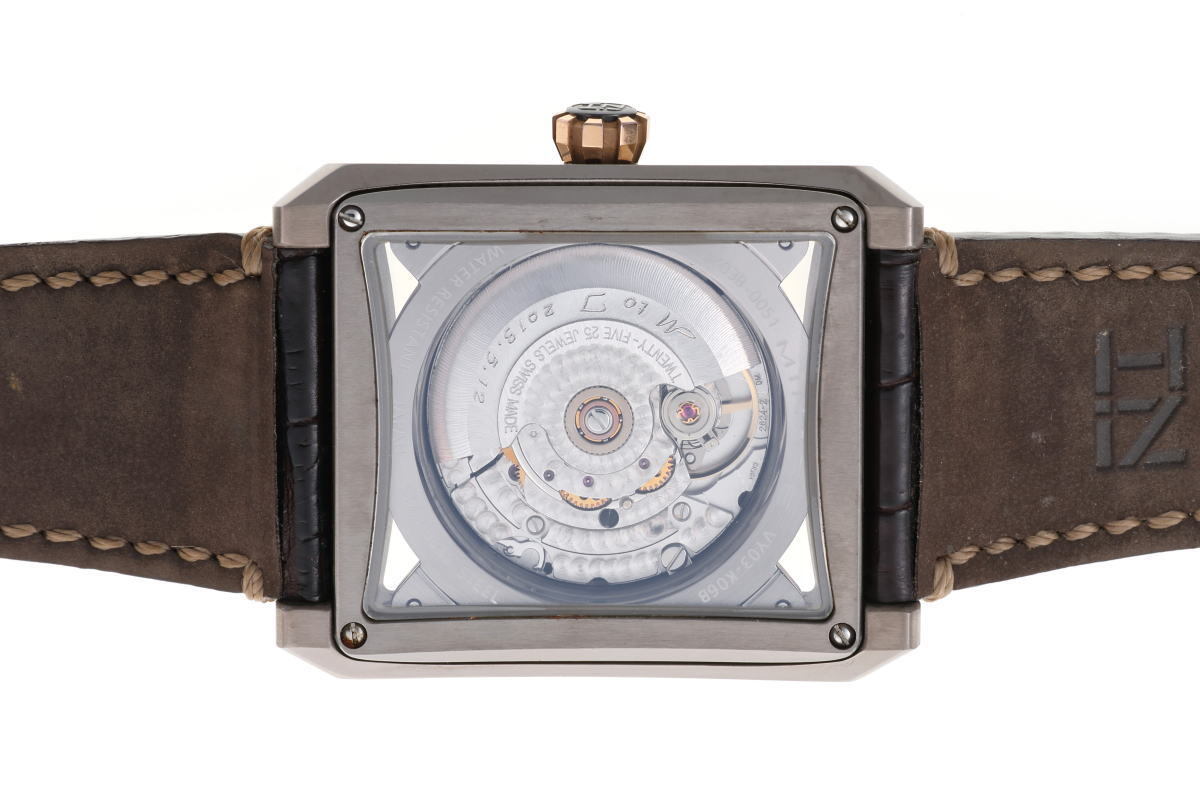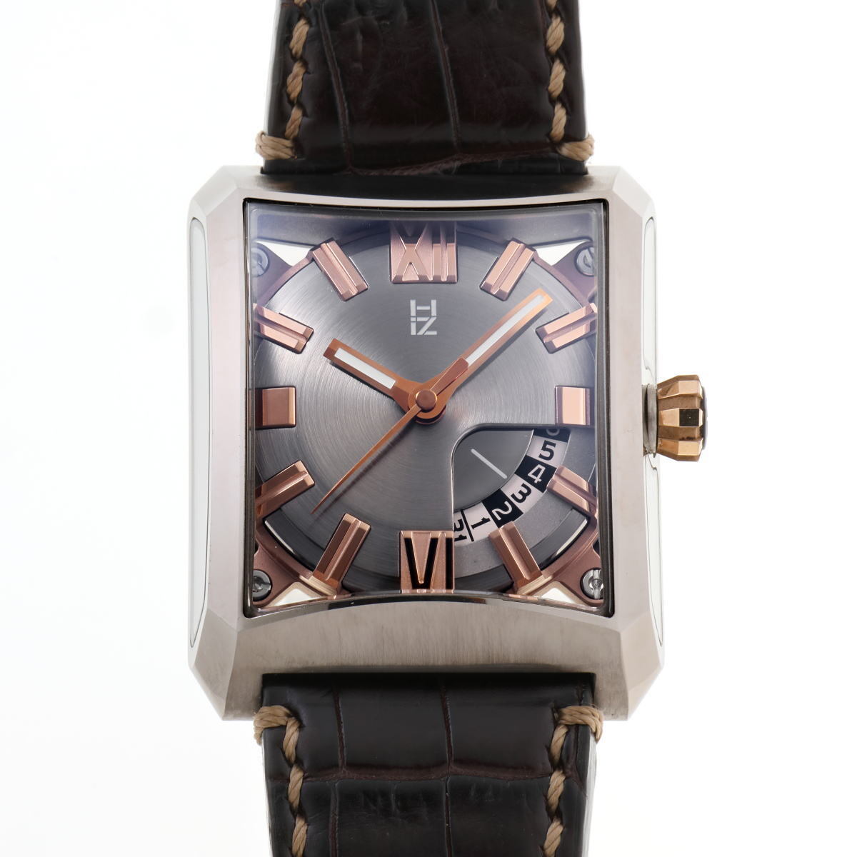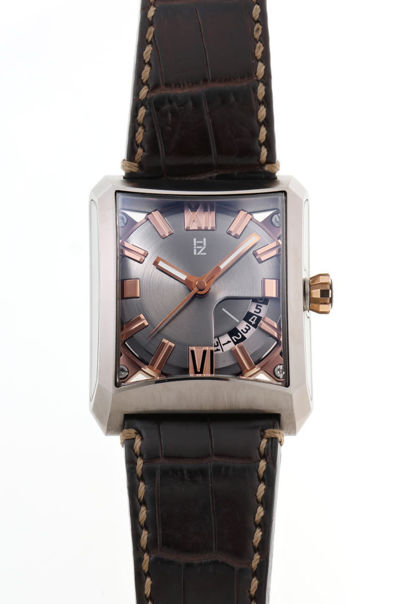 細かい小傷が見受けられます。※ローターに「イニシャルtoイニシャル・日付」が刻印されています(画像6枚目参照)。-ミナセの機械式レクタンギュラーウォッチ。HiZシリーズのFIVE WINDOWS。正面、横面、裏面にある5つの窓から立体的に文字盤を見ることができます。