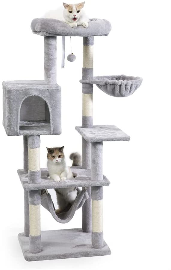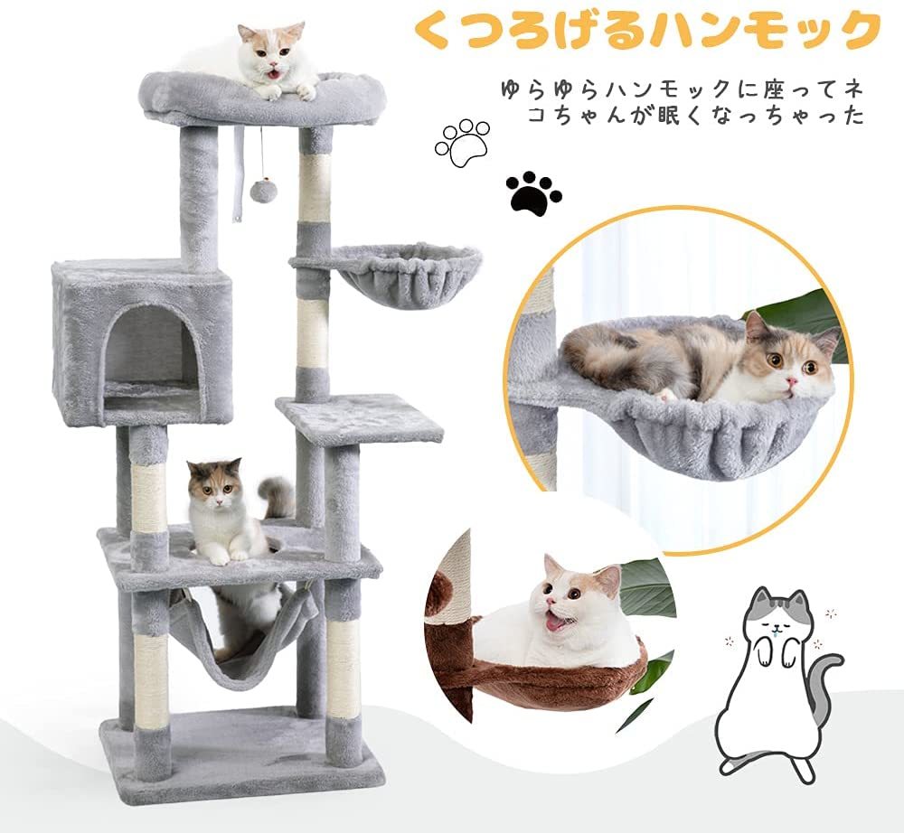 【大特価】キャットタワー 据え置き型 ハンモック おもちゃ付き (高さ140cm)グレー